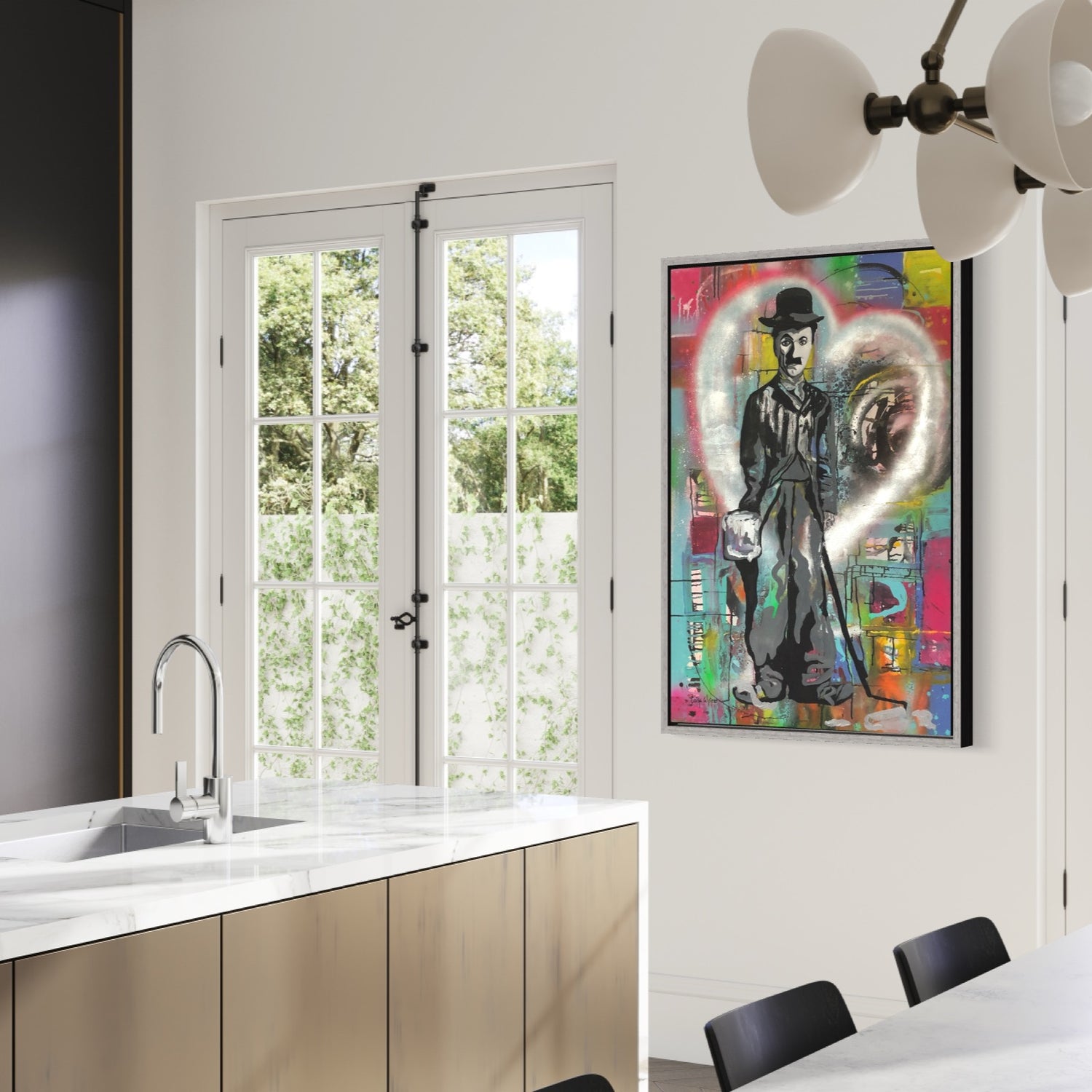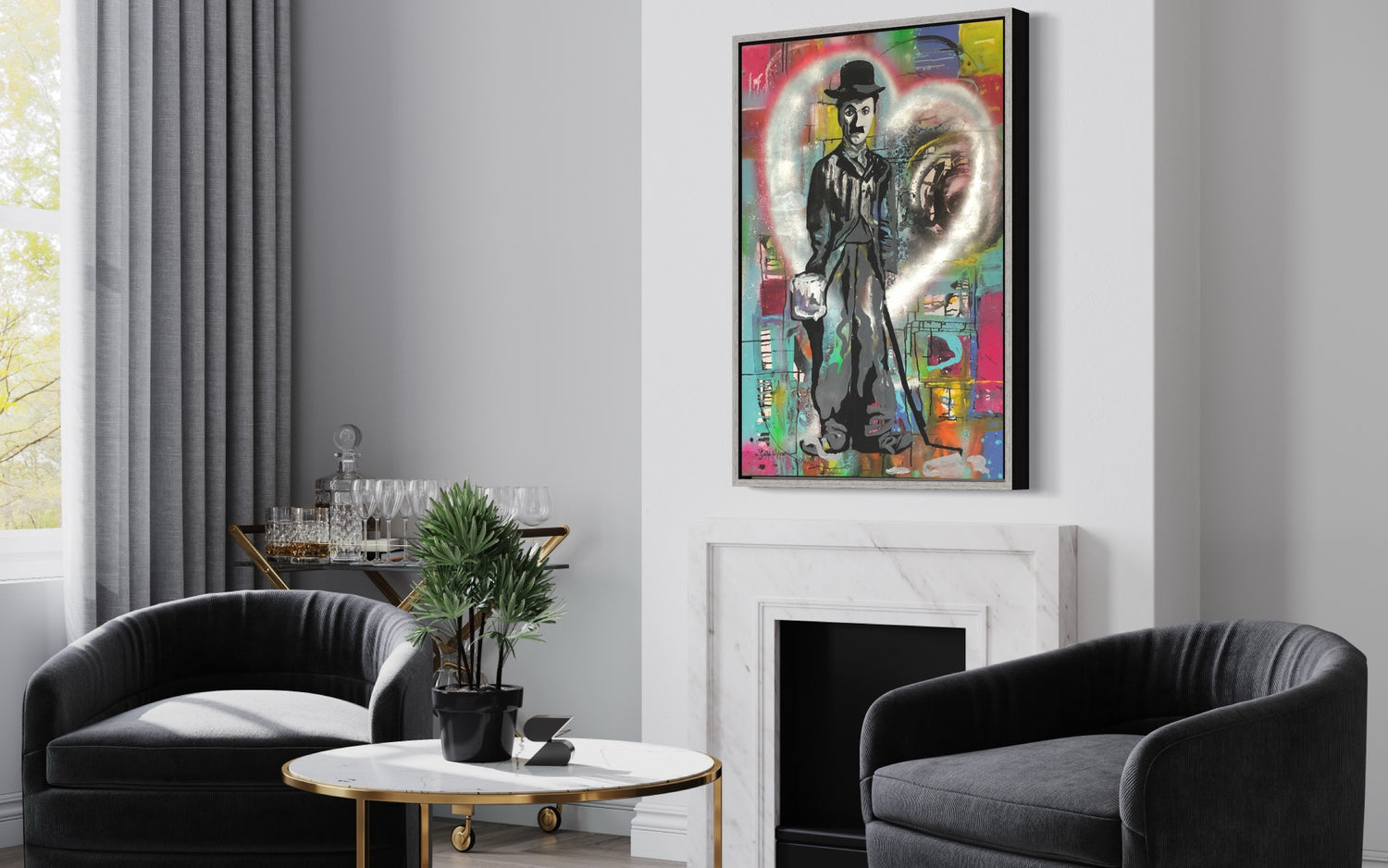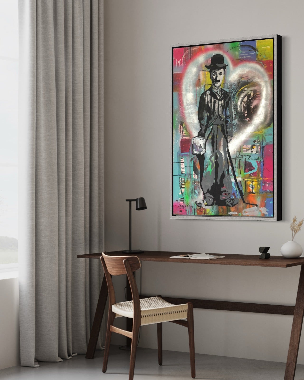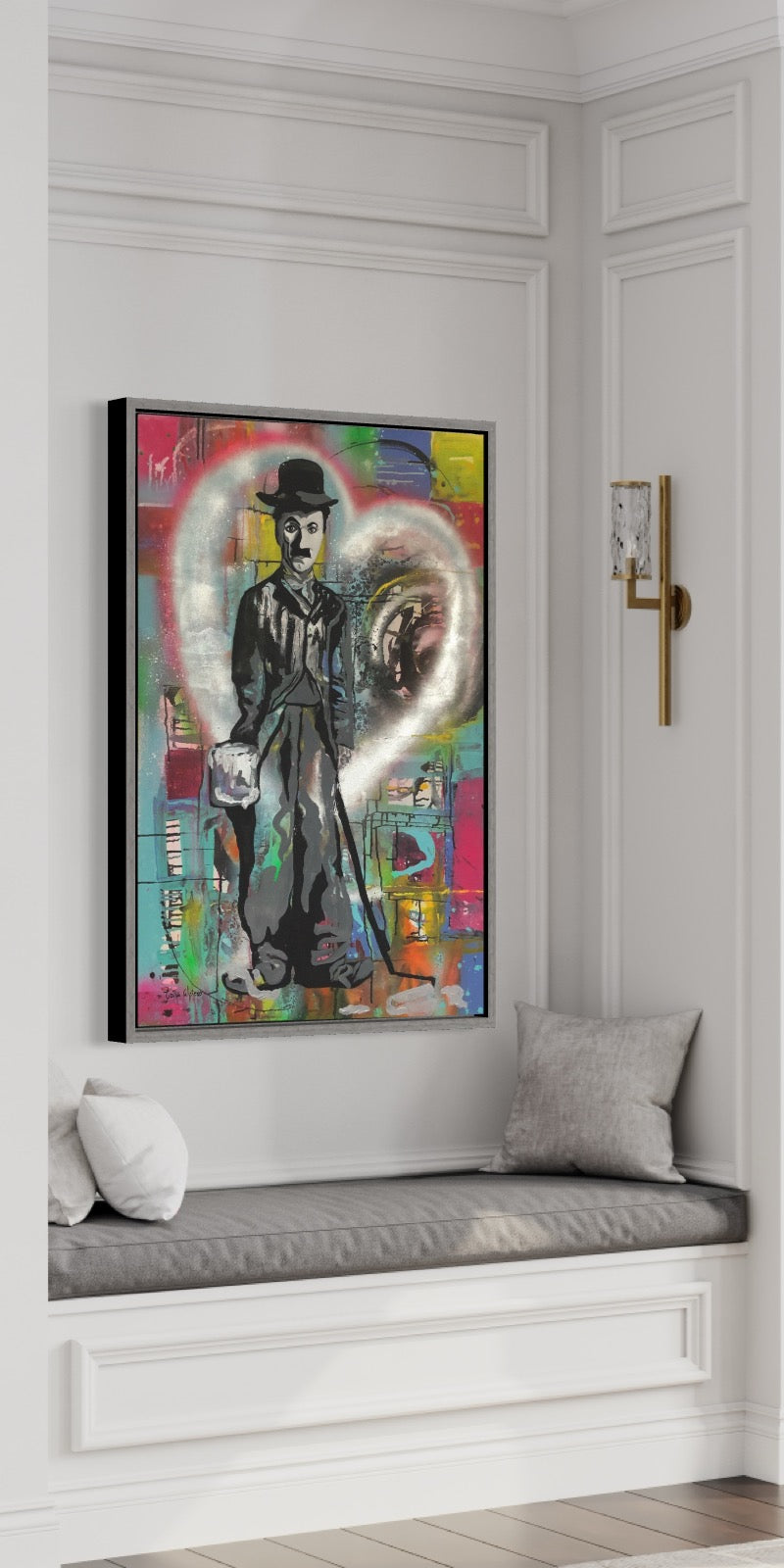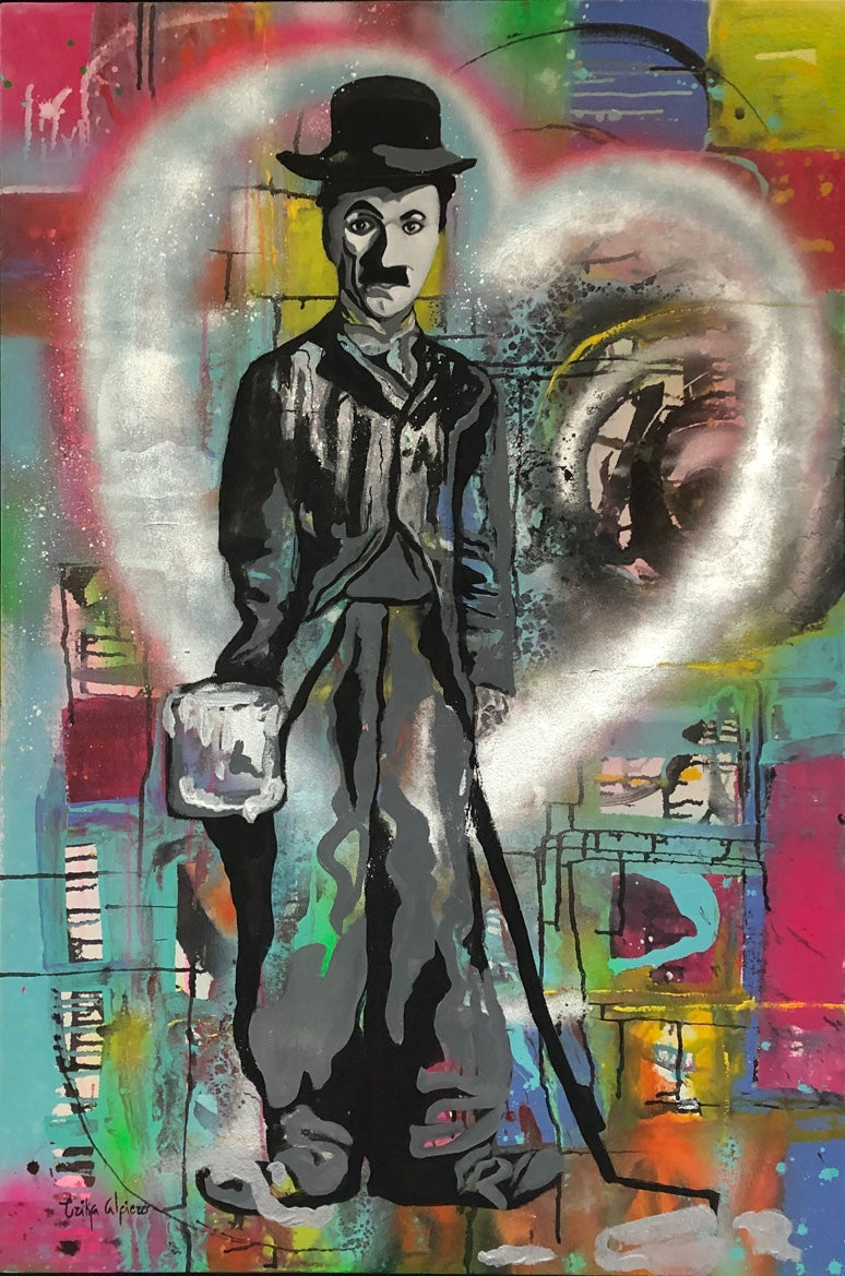 I always achieve these effects in my studio with a playlist of my favorite music, in this year 2018, "Dua Lipa" was almost always present among my most recurring selection. In the background I manage the Chinese ink with straws, also managing a controlled accident, with a third visual plane I manage the graffiti making the figure of Chaplin to voluntarily integrate, whom I have great respect as a person and actor, always a source of inspiration for artists all over the world, for me his life means work, tenacity, creativity, joy, simplicity, success, humility, love, peace, his legacy makes me fall in love and I have great respect for him.