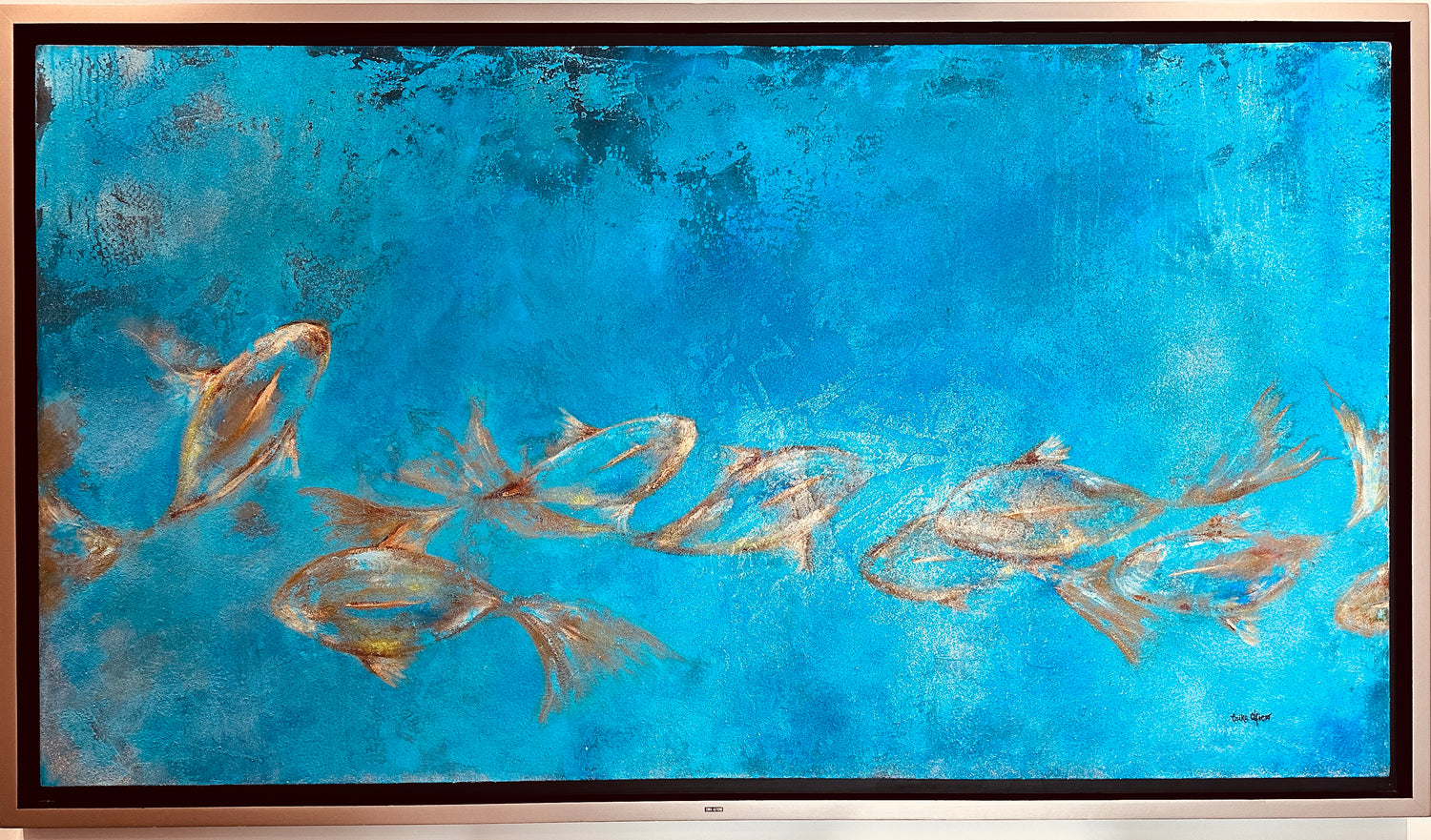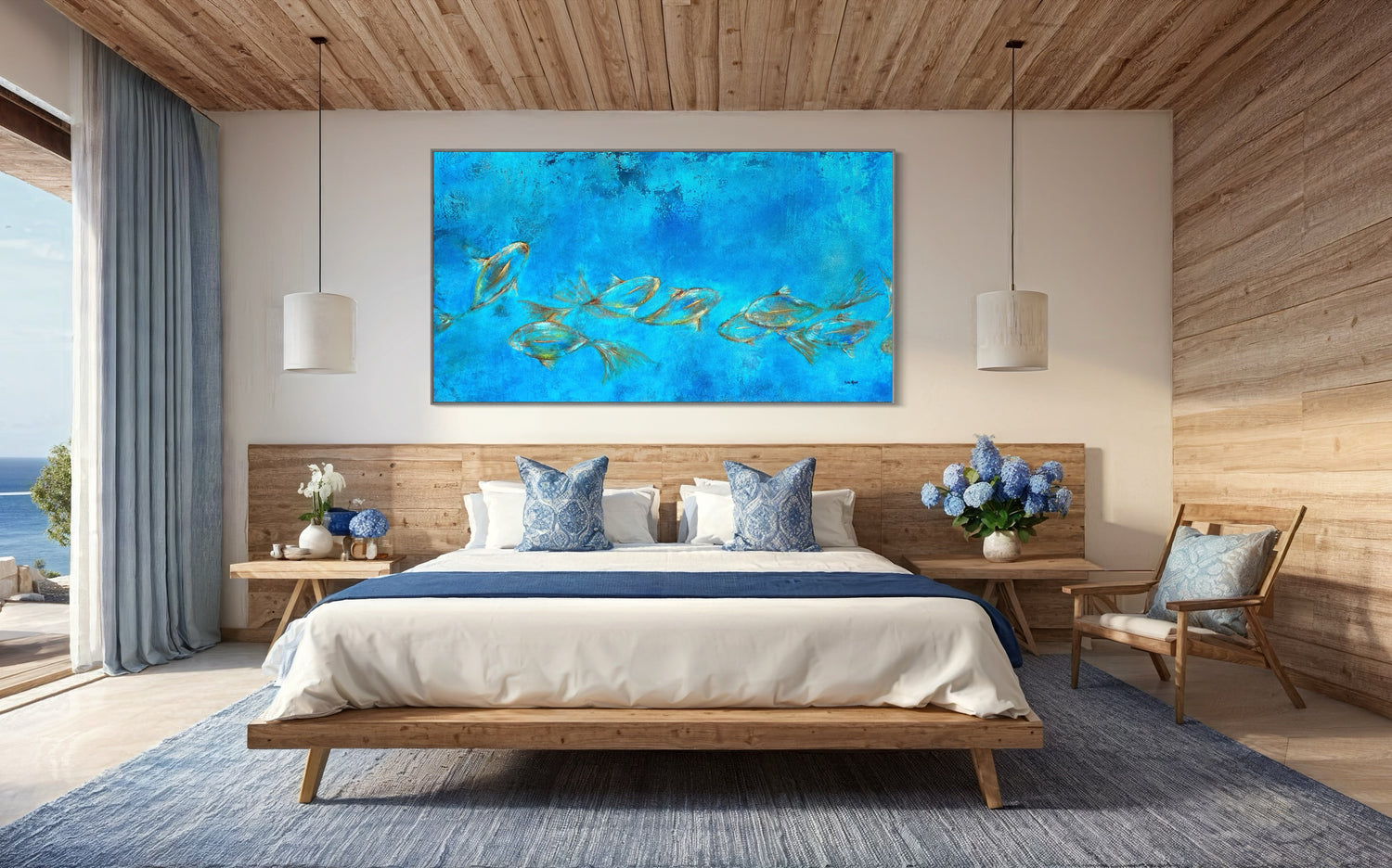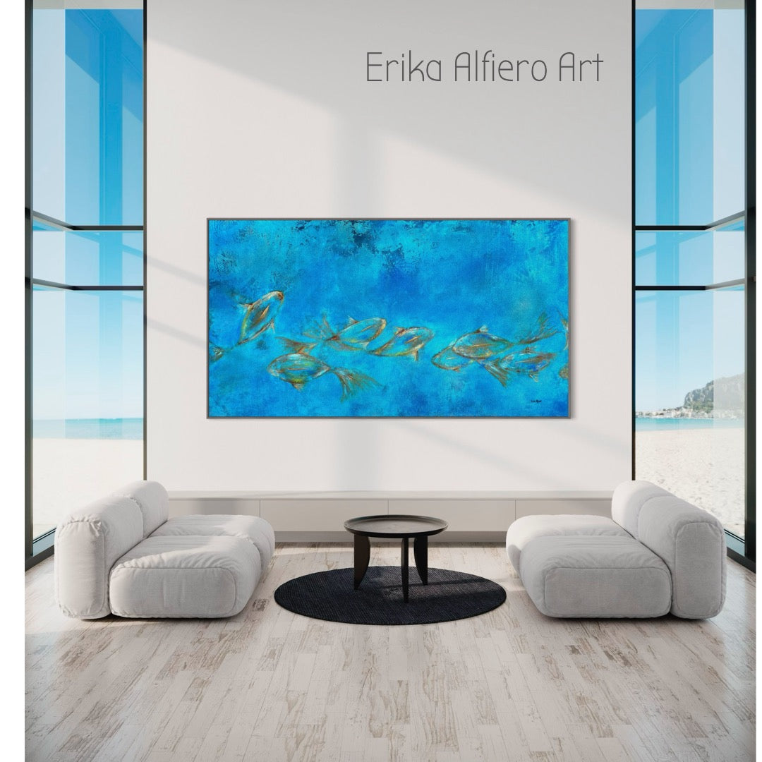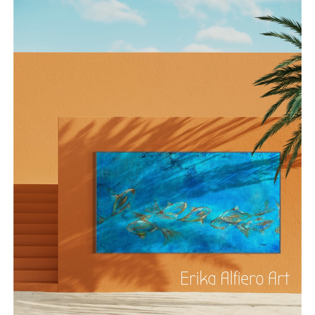 Los peces, sugeridos en tonos dorados y azules, se deslizan en un mar vibrante que respira movimiento y luz. El azul profundo abraza la composición como un espejo de infinitud, mientras la textura de la arena aporta la fuerza de la tierra unida al agua.