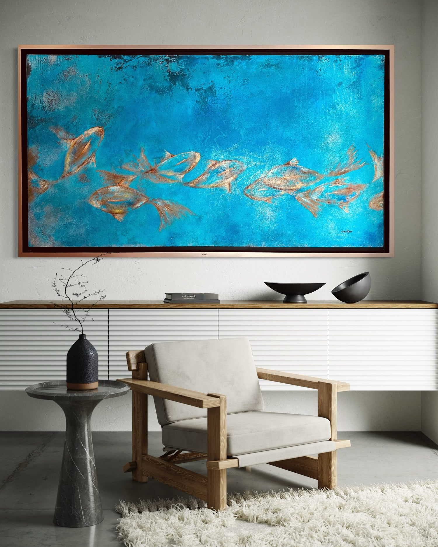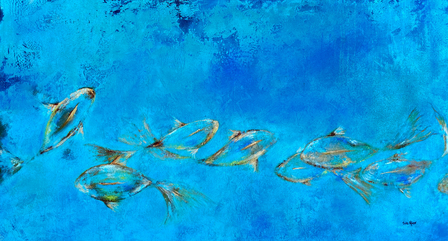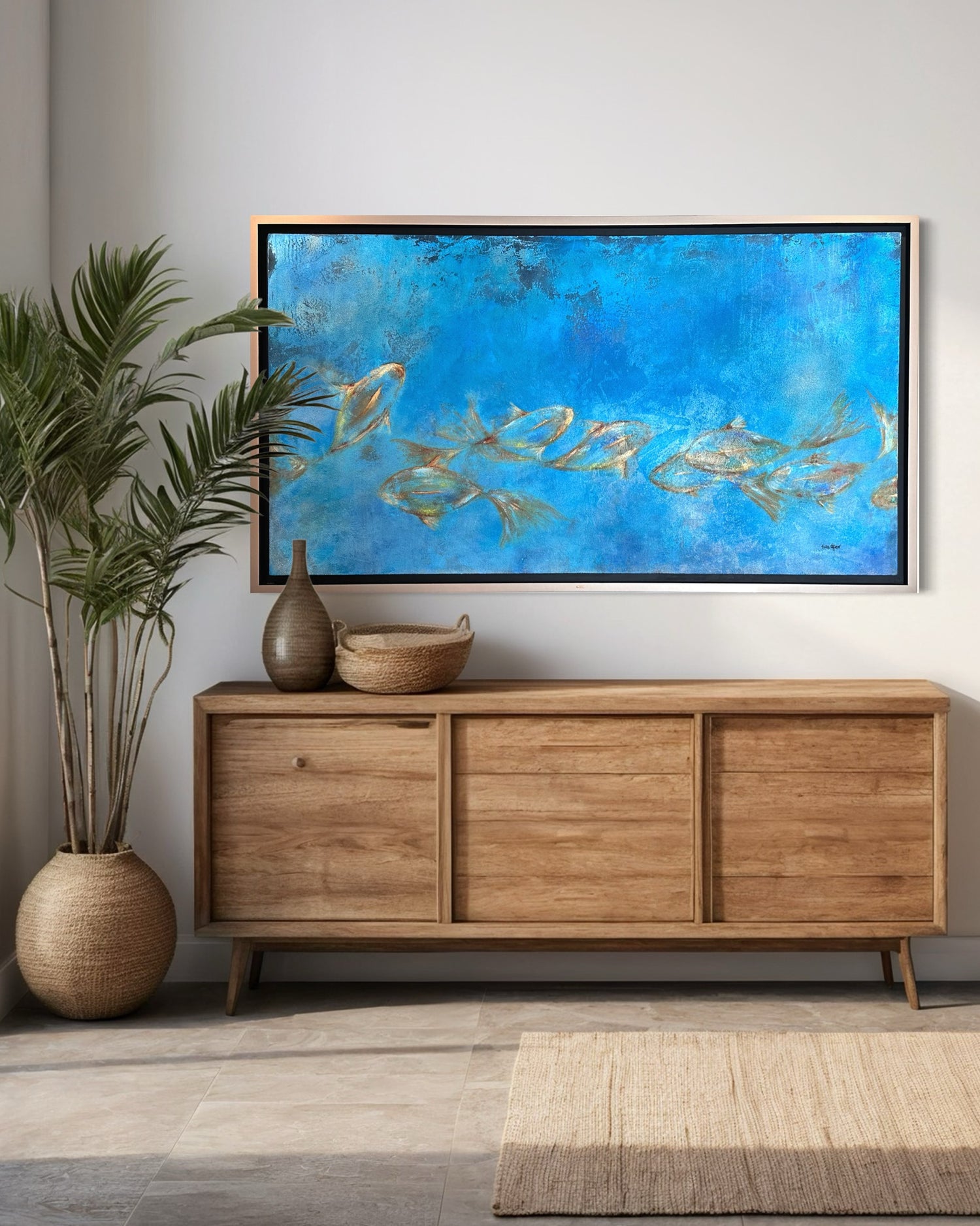 Los peces, sugeridos en tonos dorados y azules, se deslizan en un mar vibrante que respira movimiento y luz. El azul profundo abraza la composición como un espejo de infinitud, mientras la textura de la arena aporta la fuerza de la tierra unida al agua.