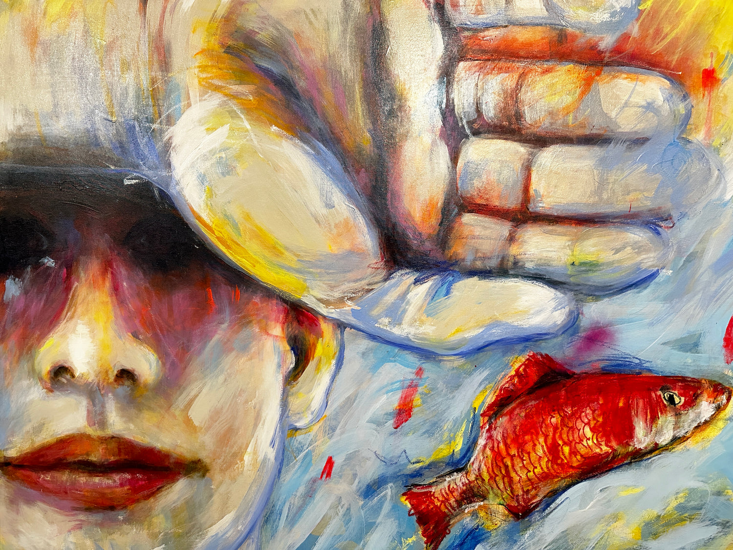 "RESILIENT" This artwork is very colorful, featuring a character that adapts like a salmon to difficult circumstances and extreme emotional temperatures, which make it strong and endow it with a unique nobility of acceptance. It's created using a mixed technique with texture that provides movement and vibrant colors that illuminate.
