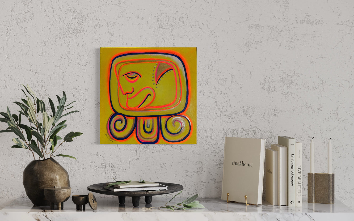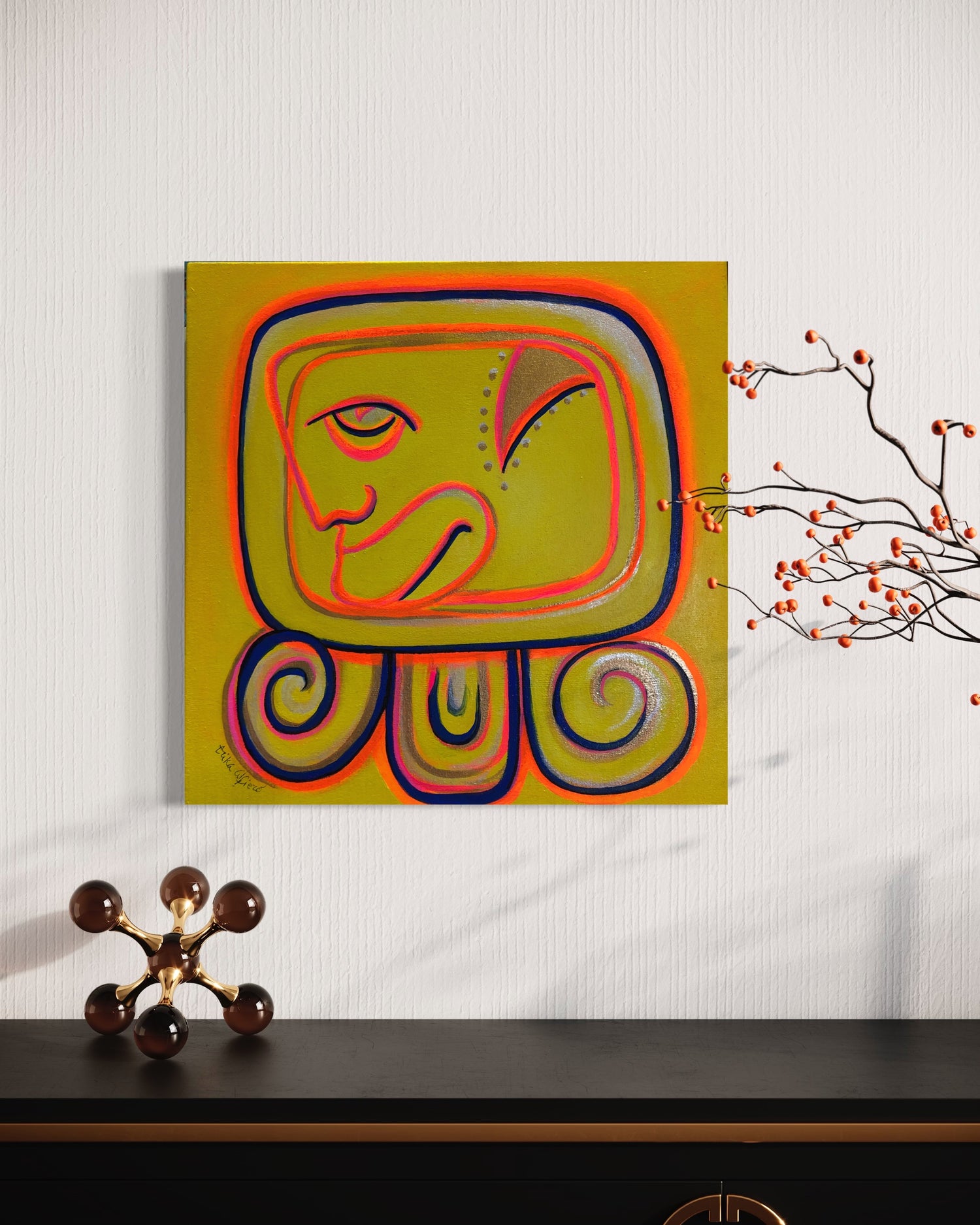 En esta obra, inspirada en EB, que significa Humano Amarillo en el Calendario Solar Maya Tzolkin, Erika Alfiero plasma la esencia del doceavo glyfo. La representación visual explora las cualidades de abundancia, cosecha, gratitud, cáliz y vacío. EB, en su transformación, aconseja cuidarse, buscar la alegría y estar dispuesto a vaciarse para llenarse de conciencia expandida. La sabiduría armónica de EB es la resonancia, y en su meditación proclama ser la cornucopia cósmica que canaliza los dones galácticos a través de la espiral. La afirmación resuena como un cáliz abierto, la expresión jubilosa de la abundancia universal. Erika conecta esta inspiración con la cosmovisión maya, donde el tiempo es arte, compartiendo este conocimiento ancestral a través de su arte, una expresión que ha esperado siglos para ser compartida con el mundo.