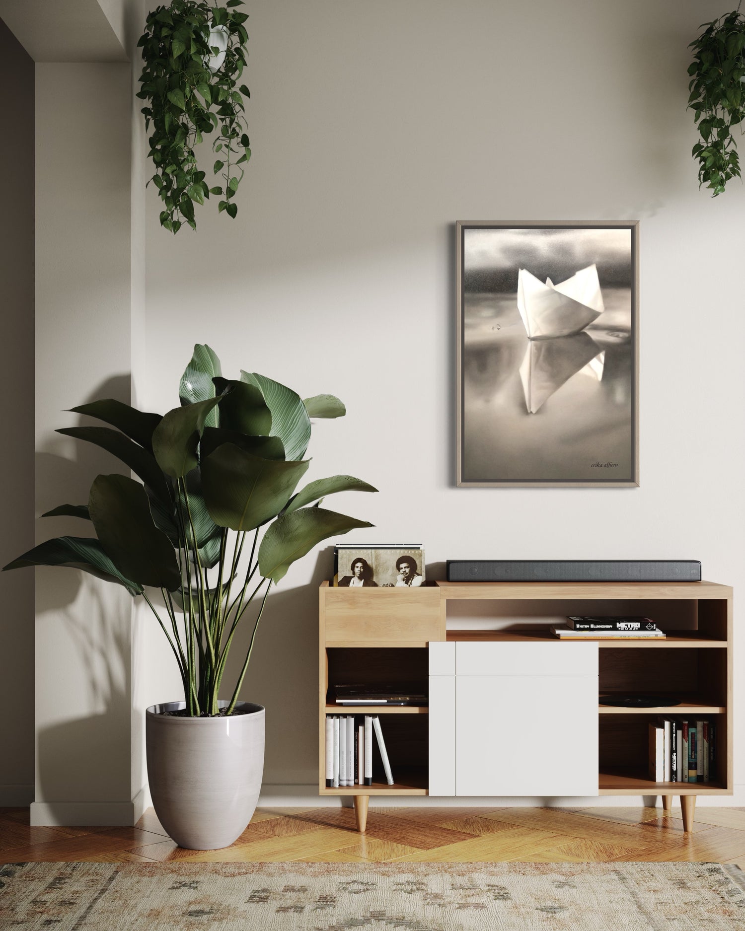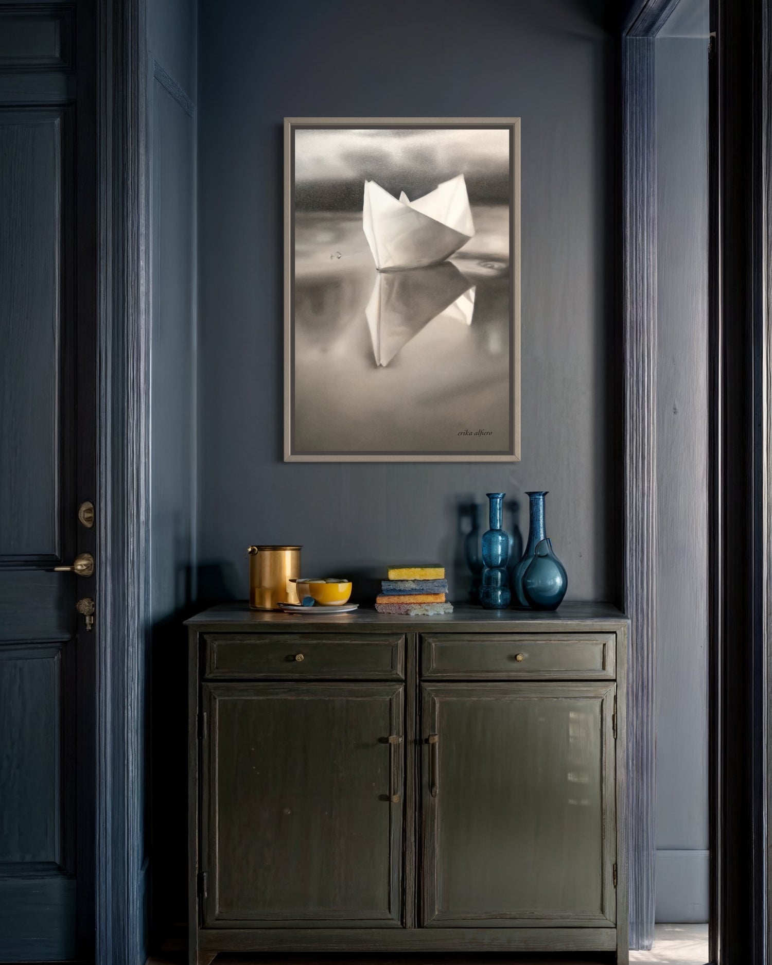La elección monocromática de la grisalla refuerza la sensación de memoria y nostalgia, como si la escena perteneciera a un pasado que se desvanece lentamente. Sin embargo, la nitidez del barquito lo convierte en un símbolo de la infancia: un instante efímero pero inolvidable, frágil pero resistente ante el paso del tiempo. El reflejo en el agua y las suaves ondulaciones generan una sensación de movimiento sutil, como si el barquito navegara entre el presente y el pasado, entre la realidad y el recuerdo.