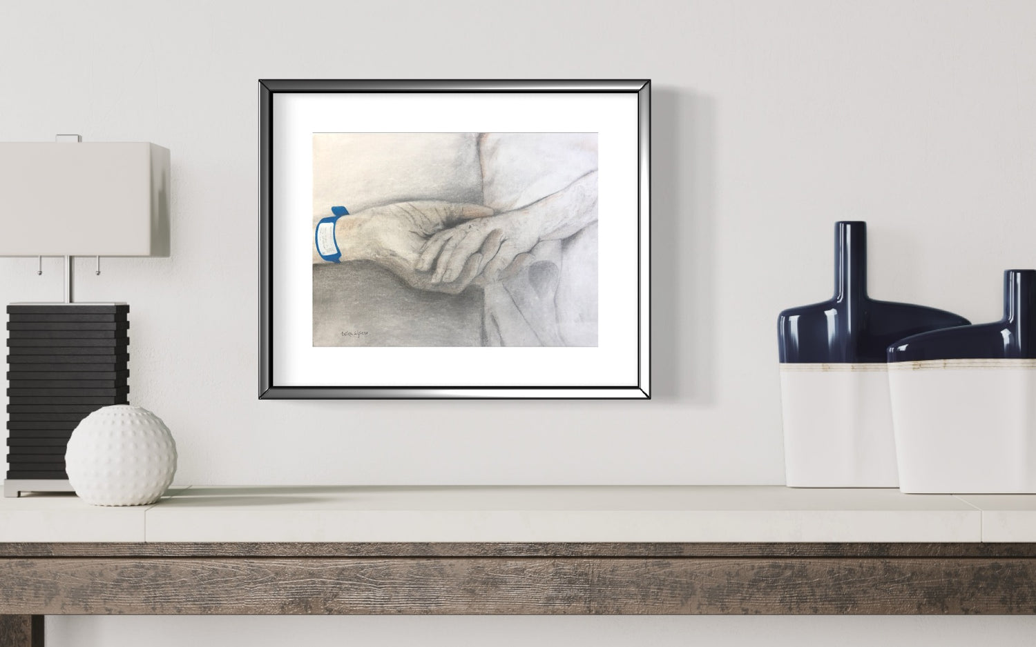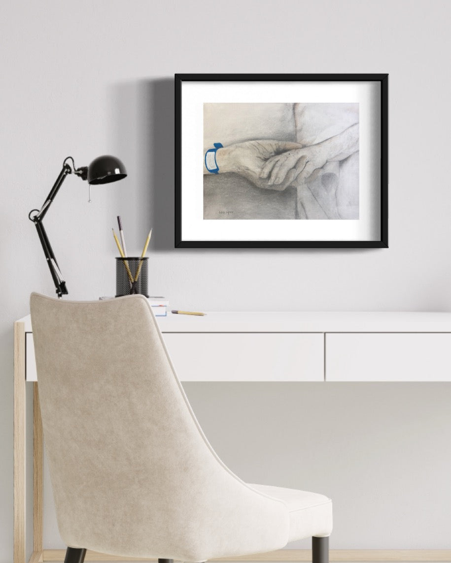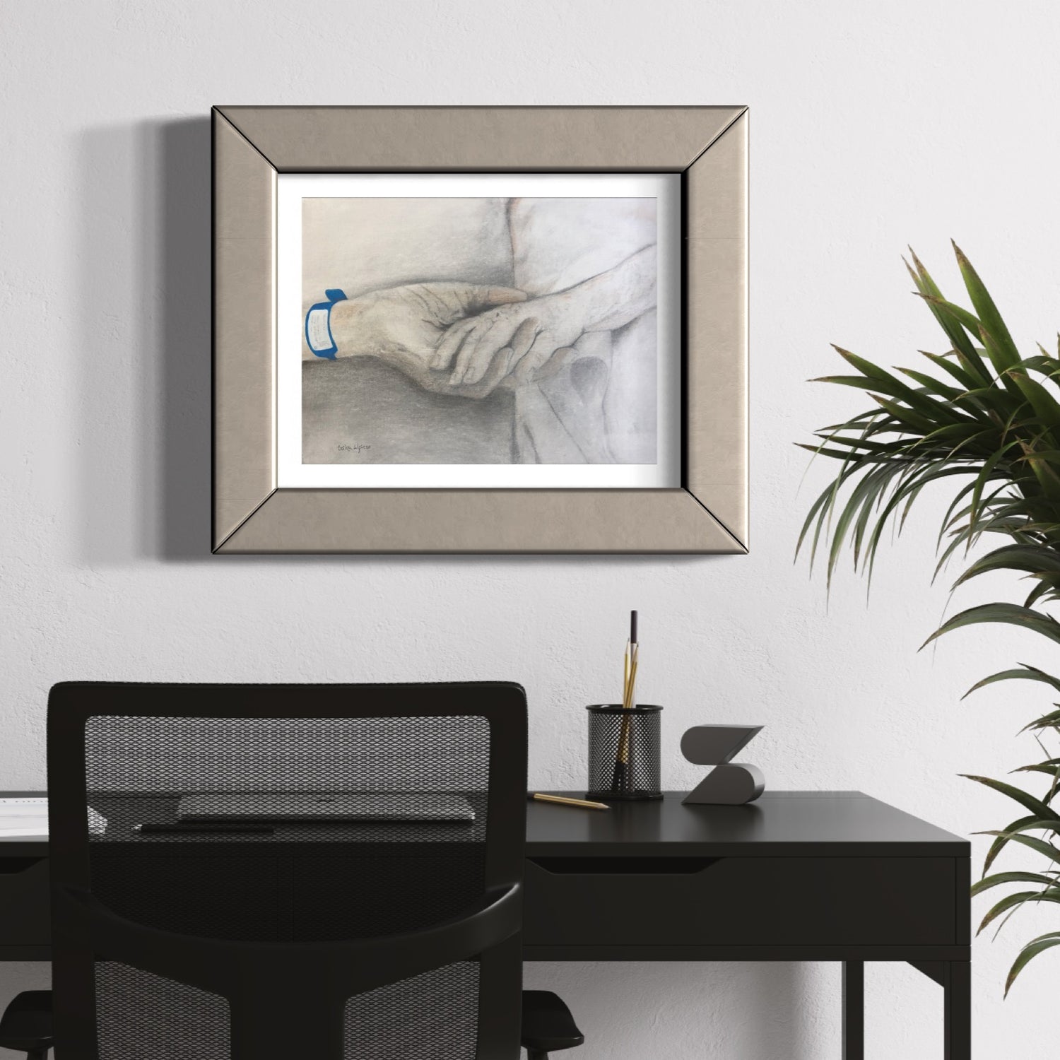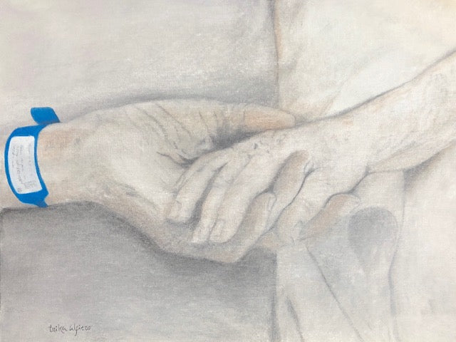 Una nueva realidad que vivimos diario en esta pandemia 2020, sin definiciones para cuando termine. Por lo cual presento esta obra, que muestra una pareja de adultos mayores tomados de la mano con un amor tan grande que logra transmitirlo el sólo roce de sus manos, aun, sin ver sus rostros.