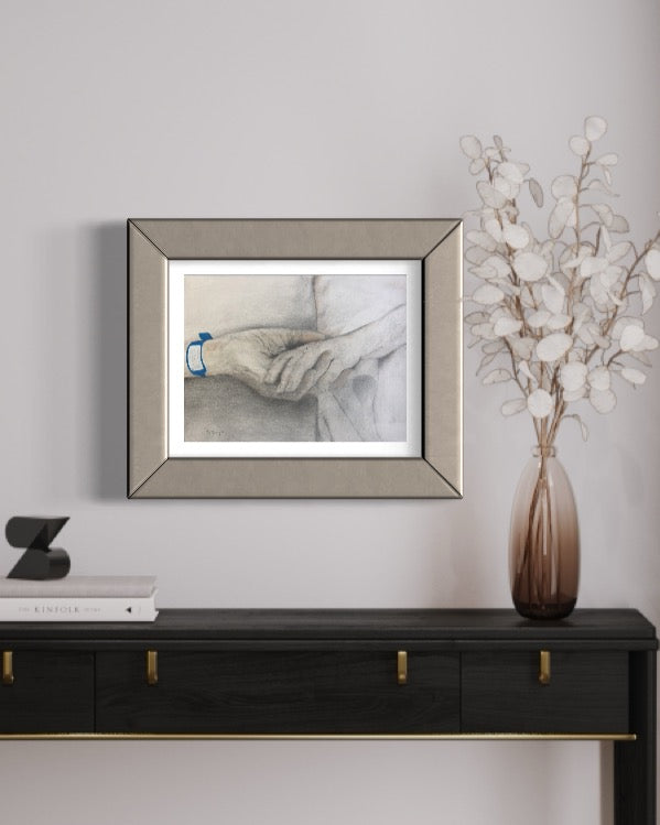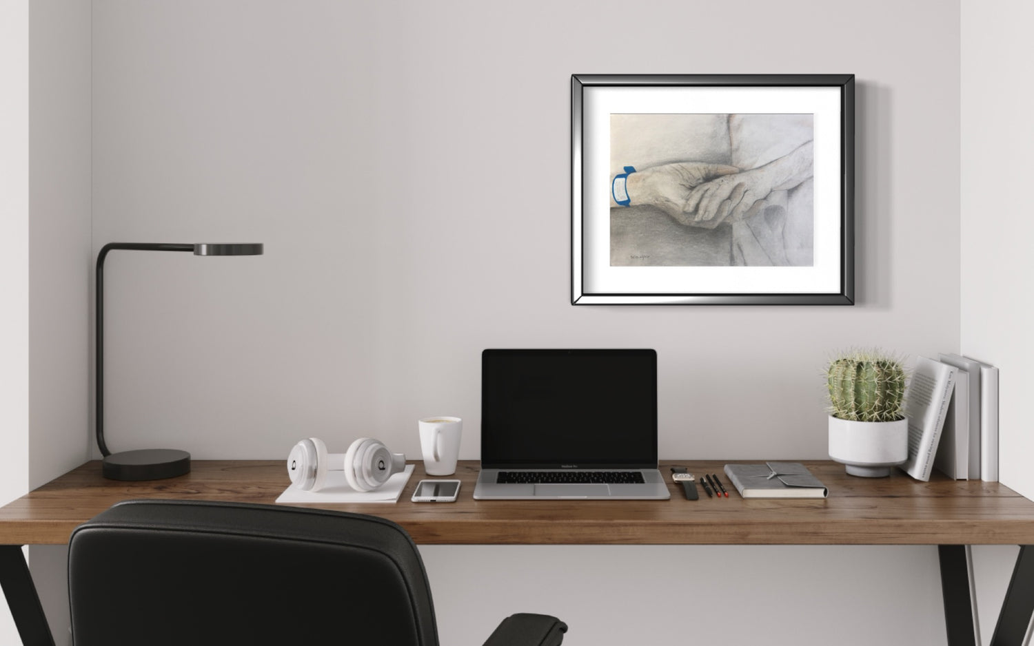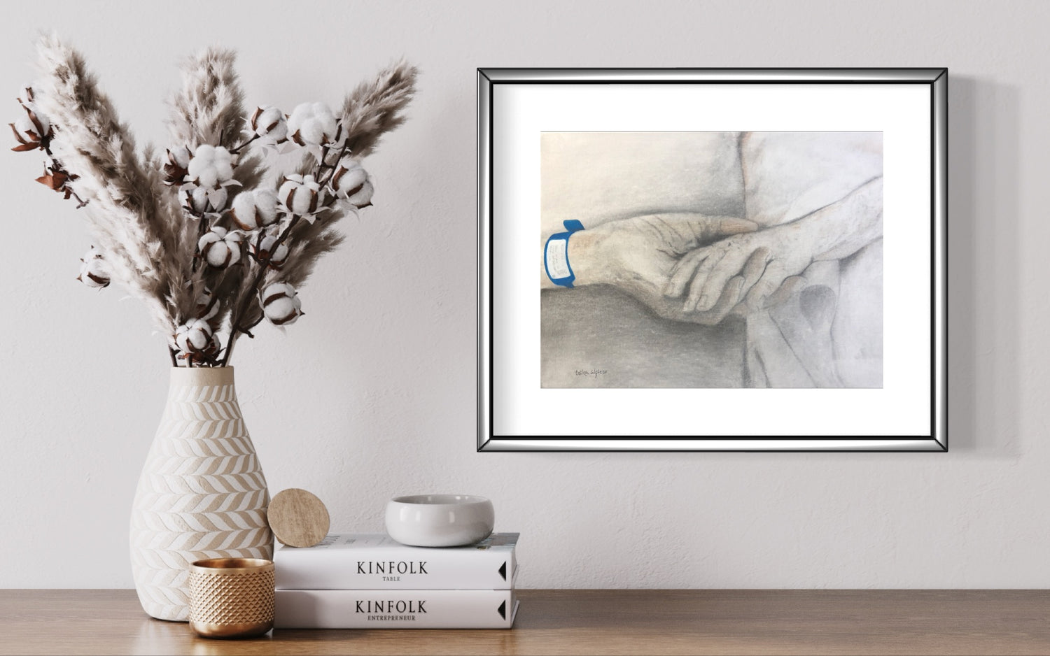 Una nueva realidad que vivimos diario en esta pandemia 2020, sin definiciones para cuando termine. Por lo cual presento esta obra, que muestra una pareja de adultos mayores tomados de la mano con un amor tan grande que logra transmitirlo el sólo roce de sus manos, aun, sin ver sus rostros.