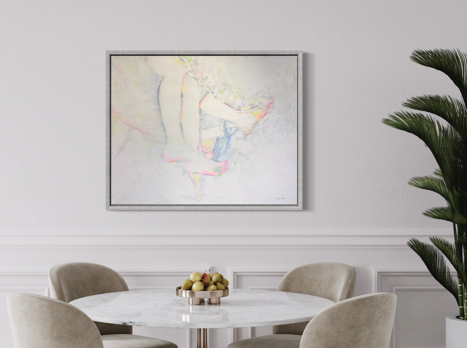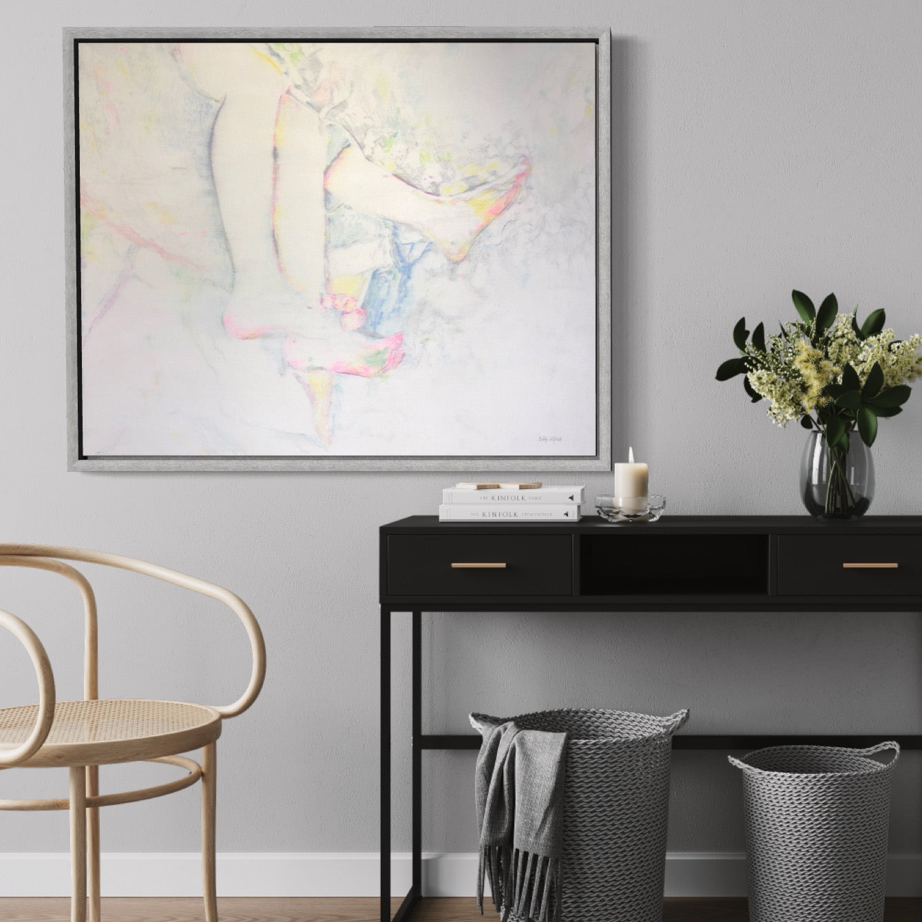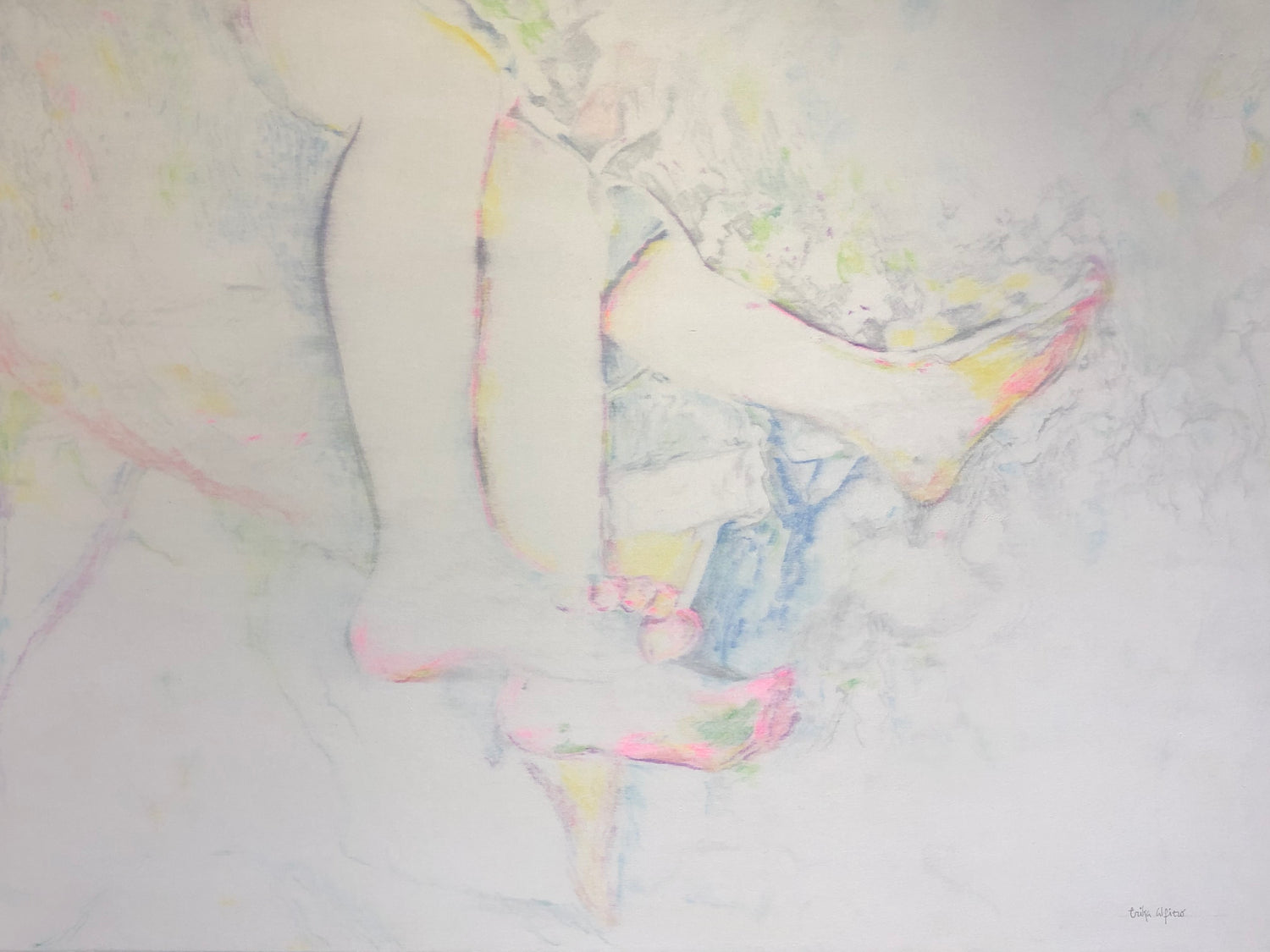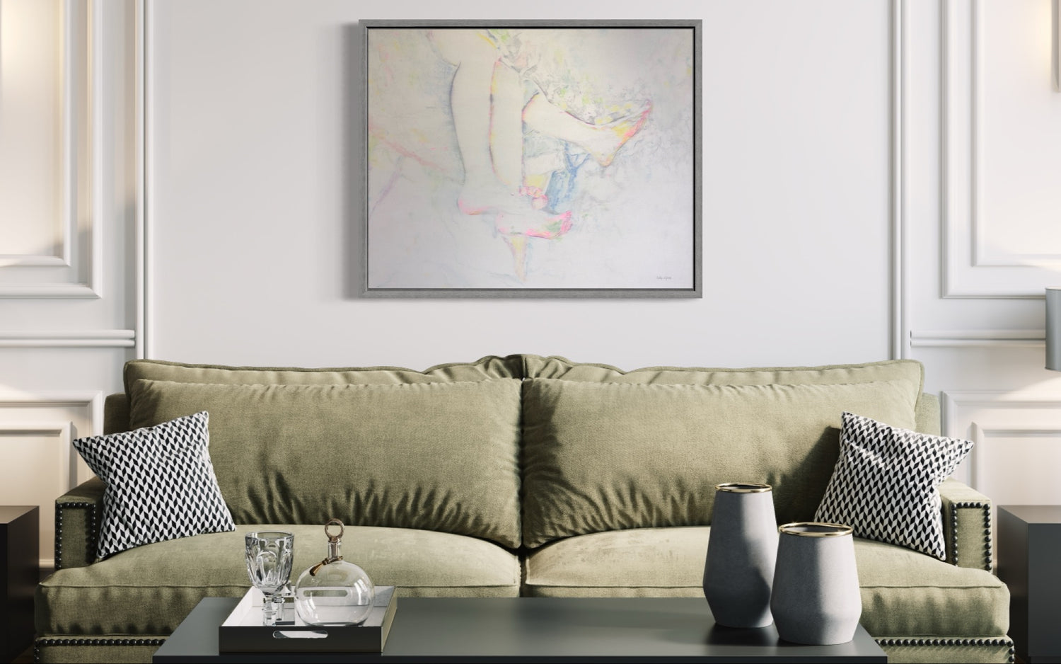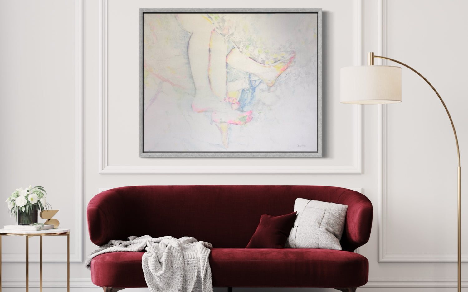 La artista Erika Alfiero emplea su técnica de acuarela vaporizada para difuminar los contornos y permitir que la luz y el color se fundan con suavidad. La atmósfera etérea y casi onírica de la obra transmite la sensación de un tiempo detenido, donde los juegos de la infancia se convierten en refugios emocionales.