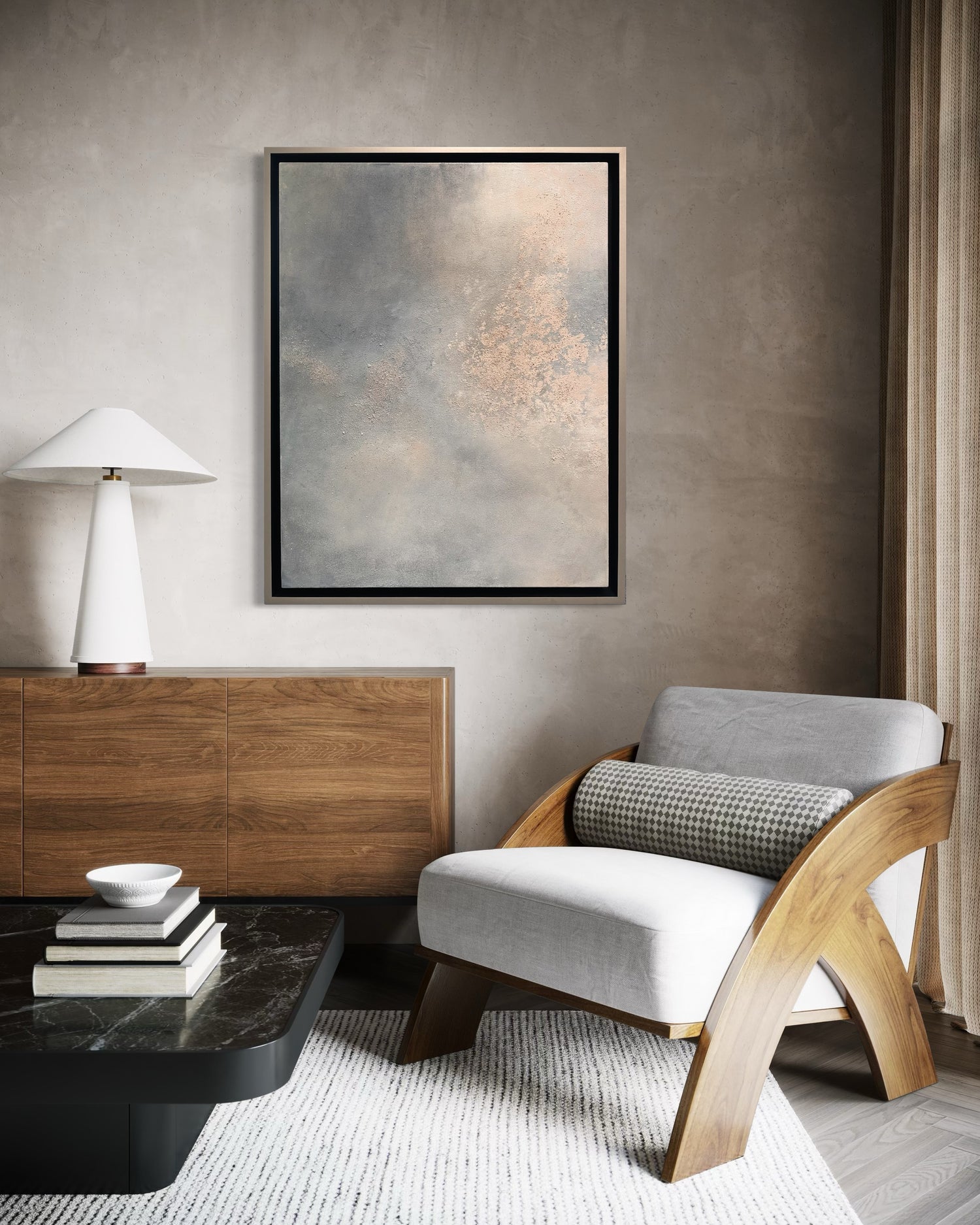 Creada con arenas auténticas de la Isla de Holbox y de Tulum, Mar, Arena y Paz forma parte de la serie Mar y Arena. En esta obra, la artista transforma la materia viva del paisaje en un lenguaje visual que evoca calma y contemplación. Las texturas y tonalidades se entrelazan para transmitir la serenidad profunda del mar y la unión sutil entre la tierra y el agua, invitando a una experiencia de quietud y conexión con la naturaleza.