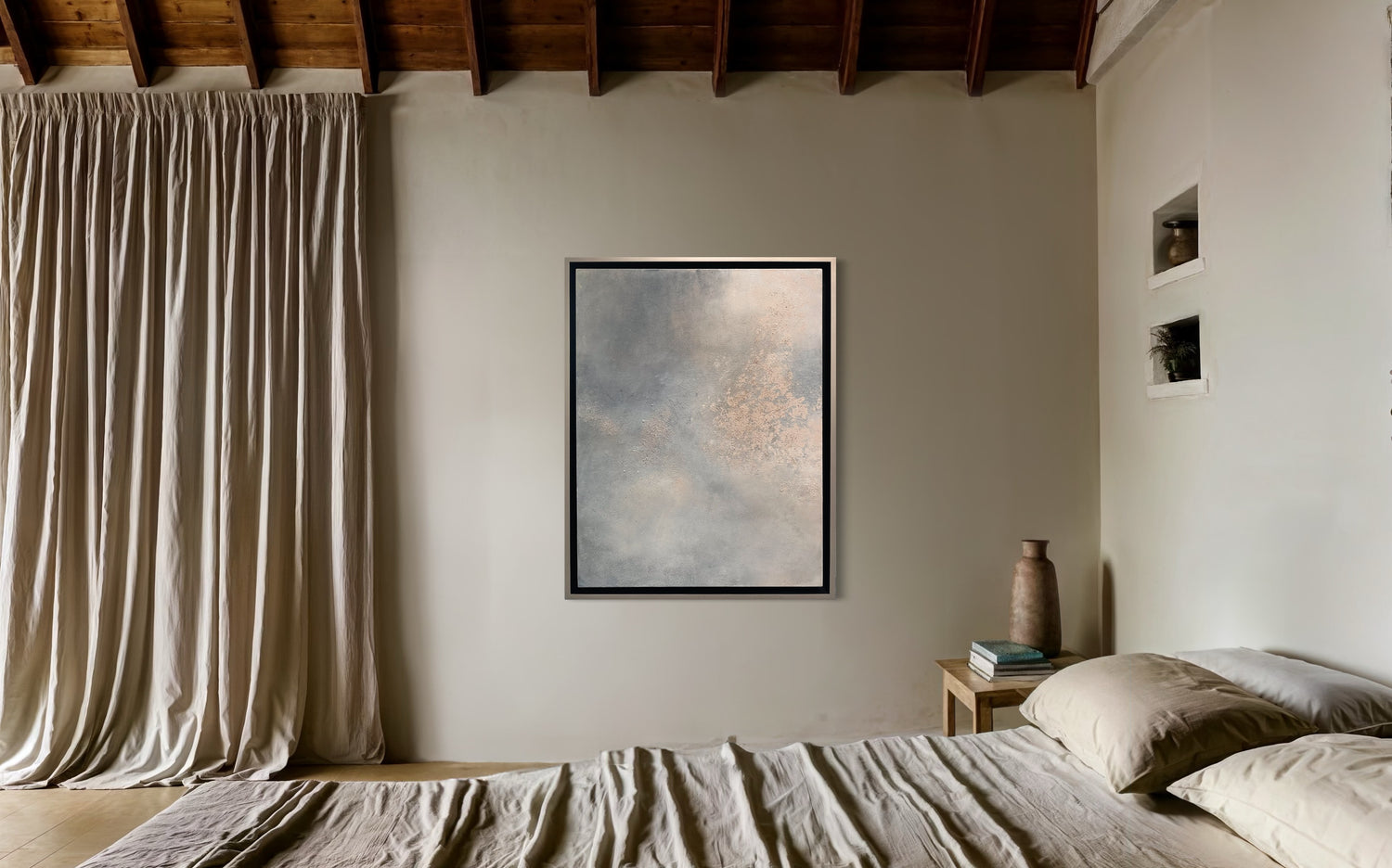 Created with authentic sands from Holbox Island and Tulum, Sea, Sand and Peace is part of the Sea and Sand series. In this work, the artist transforms the living essence of the landscape into a visual language that evokes calm and contemplation. Textures and tones intertwine to convey the deep serenity of the sea and the subtle union between earth and water, inviting a profound experience of stillness and connection with nature.