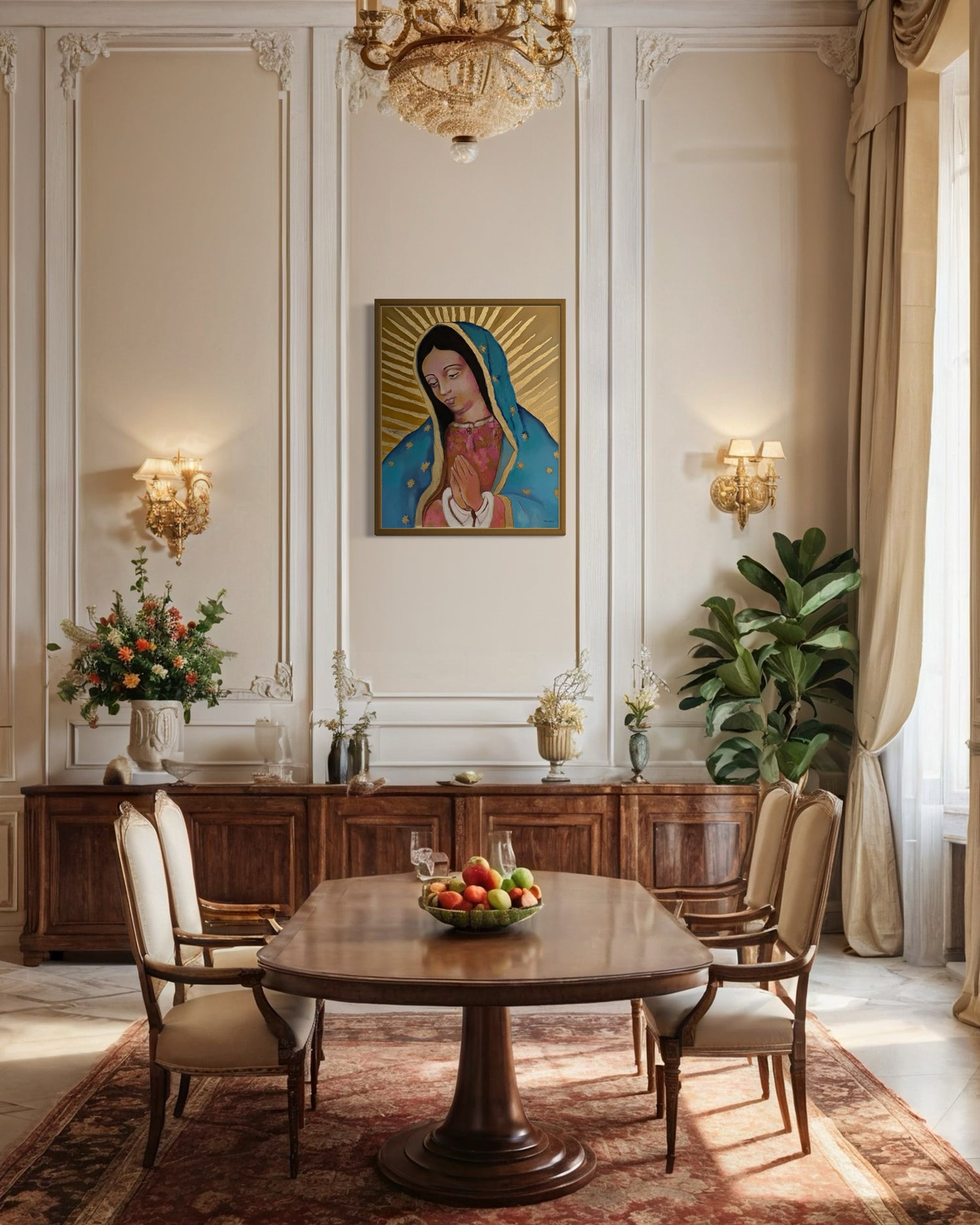 Bajo un cielo dorado que se abre en resplandores de luz divina, la Virgen de Guadalupe se revela en silencio, con un manto azul celeste sembrado de estrellas y un corazón que late compasión.