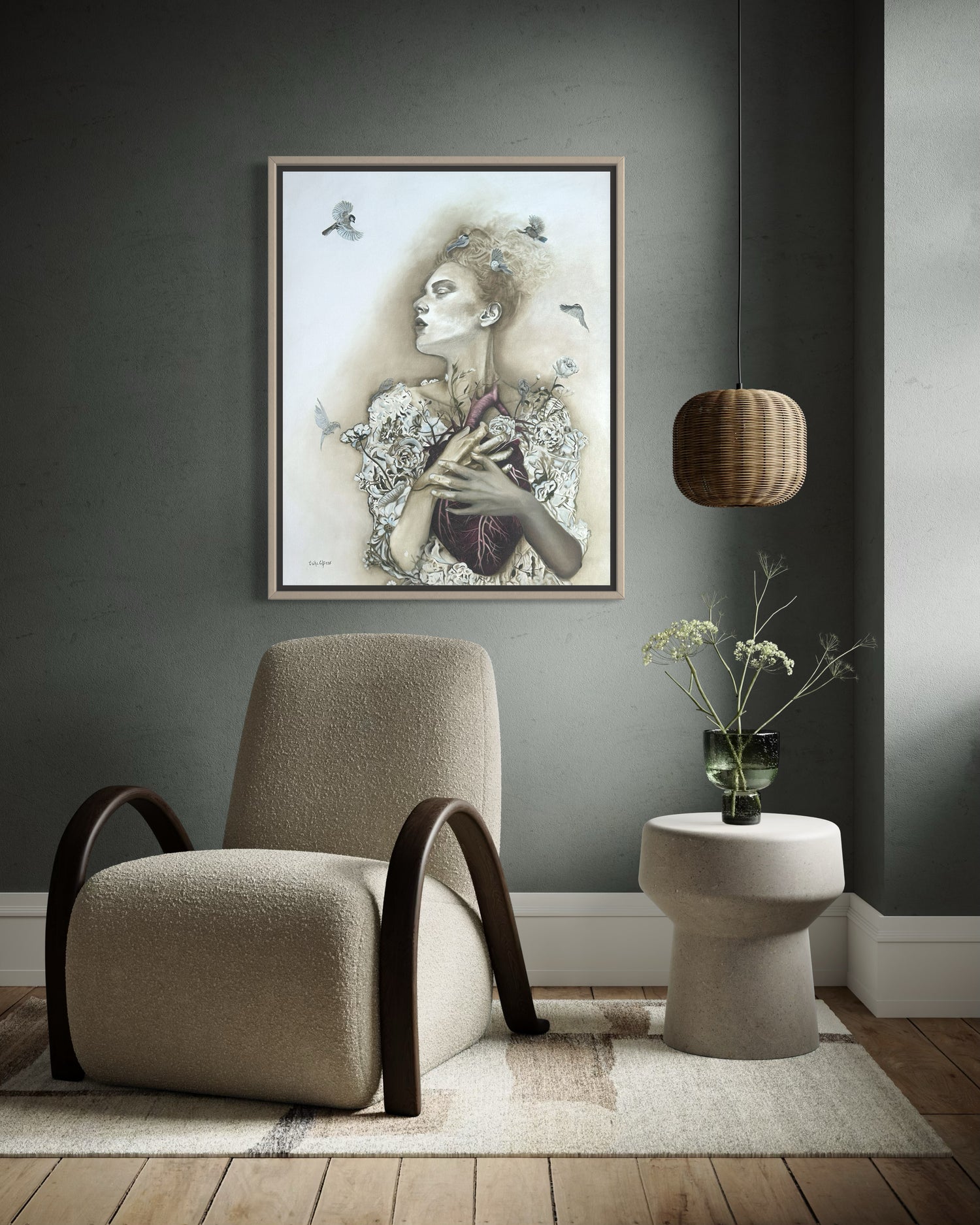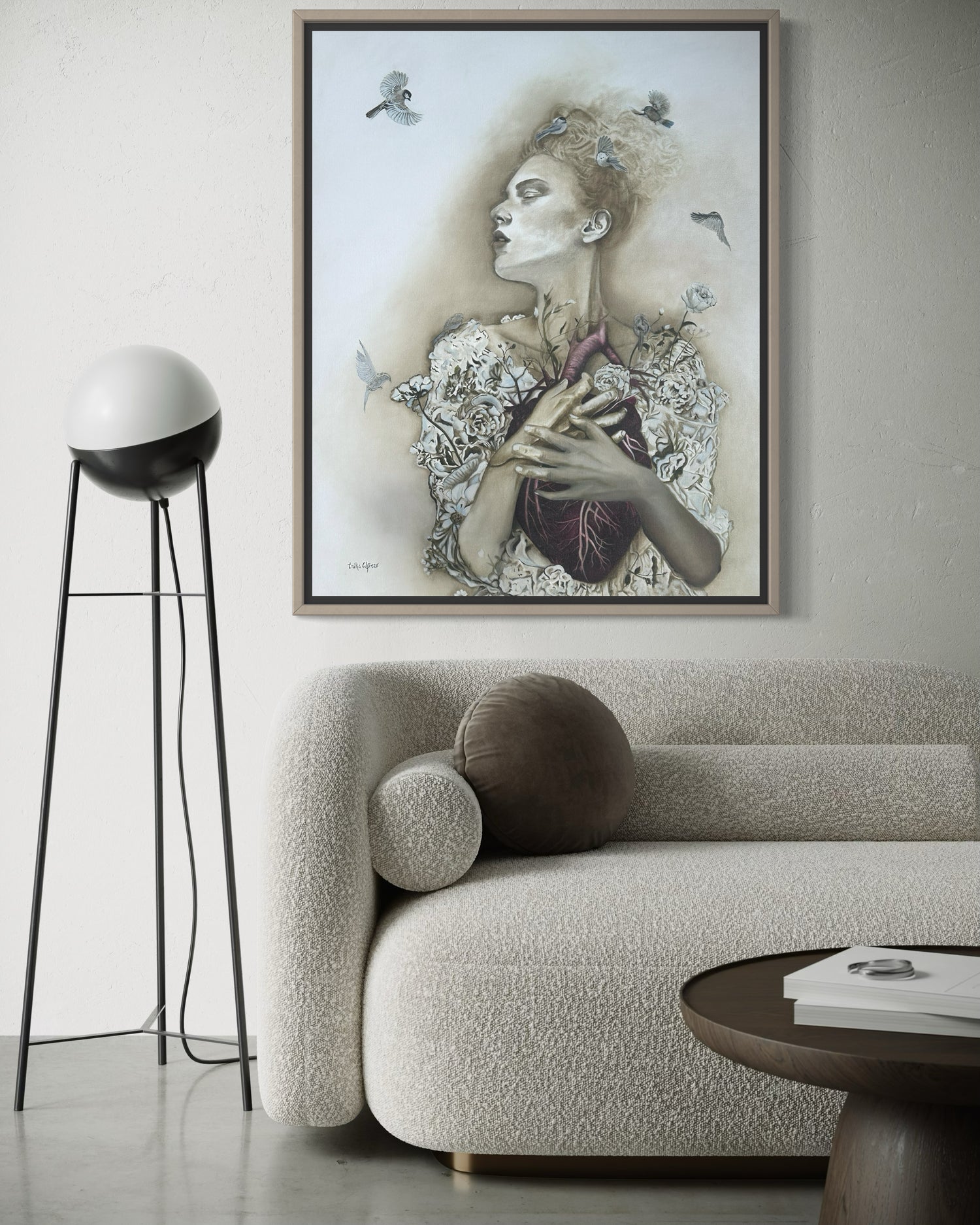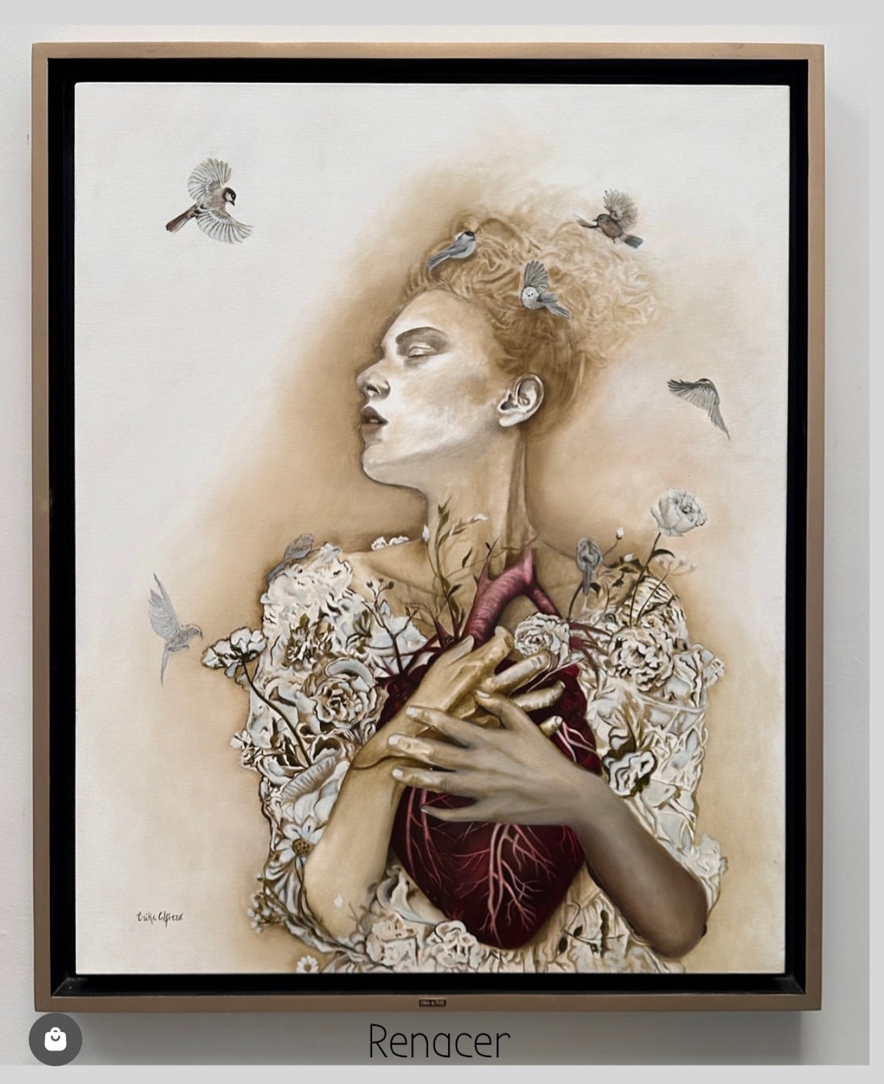 "Renacer", de Erika Alfiero, es una obra de realismo figurativo en óleo que encapsula la esencia de la transformación y la resiliencia. La pieza presenta una figura femenina con una expresión serena y contemplativa, cuyos tonos suaves y etéreos contrastan con la fuerza del elemento central: un corazón anatómicamente detallado, vibrante en tonalidades profundas de rojo y púrpura, sostenido con delicadeza por sus propias manos.