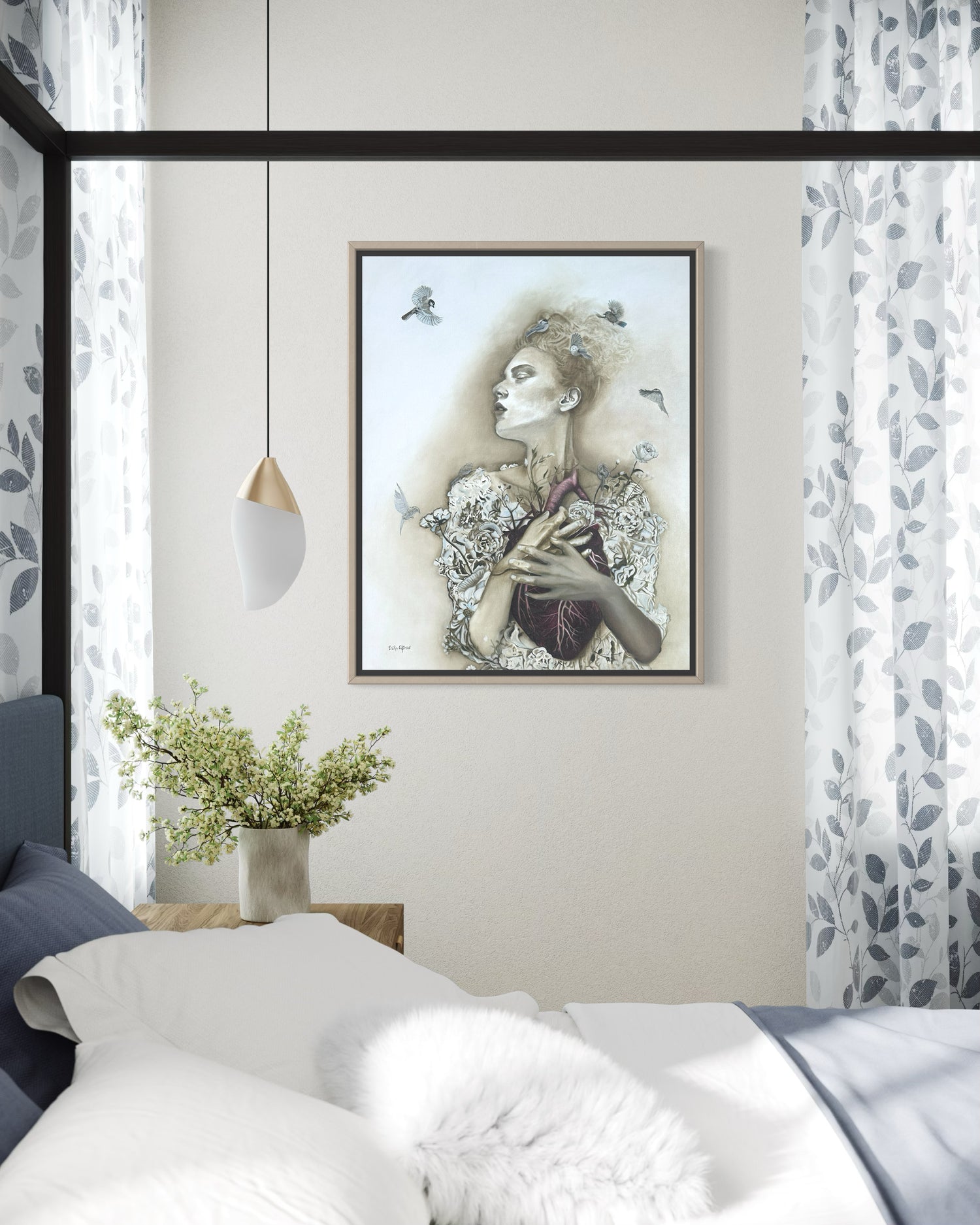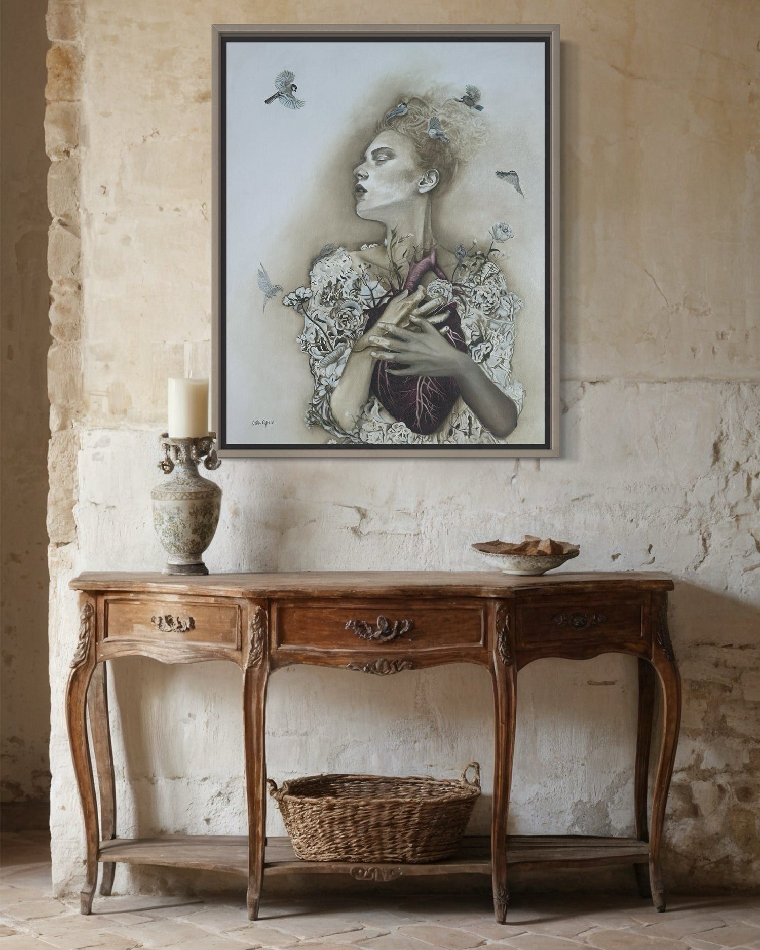 La técnica de grisalla utilizada en la figura y el fondo otorga una atmósfera onírica y atemporal, reforzada por la presencia de aves en pleno vuelo. Estos pequeños seres parecen emerger de su cabello y su entorno, simbolizando la libertad, el alma en expansión y el ciclo de la vida. La fusión entre la piel y las flores que la rodean sugiere un renacimiento natural, donde el cuerpo y la emoción se entrelazan con la esencia misma de la tierra y la existencia.