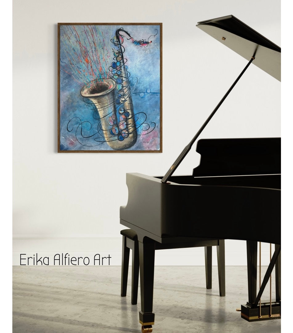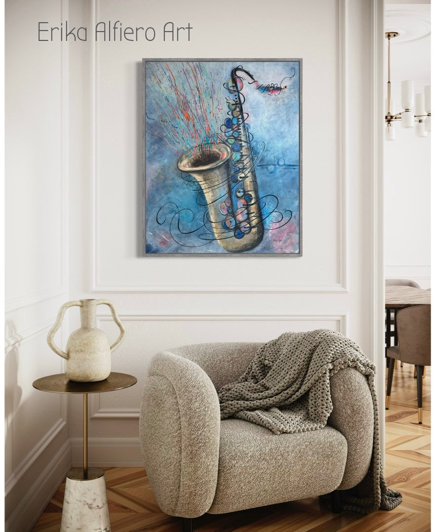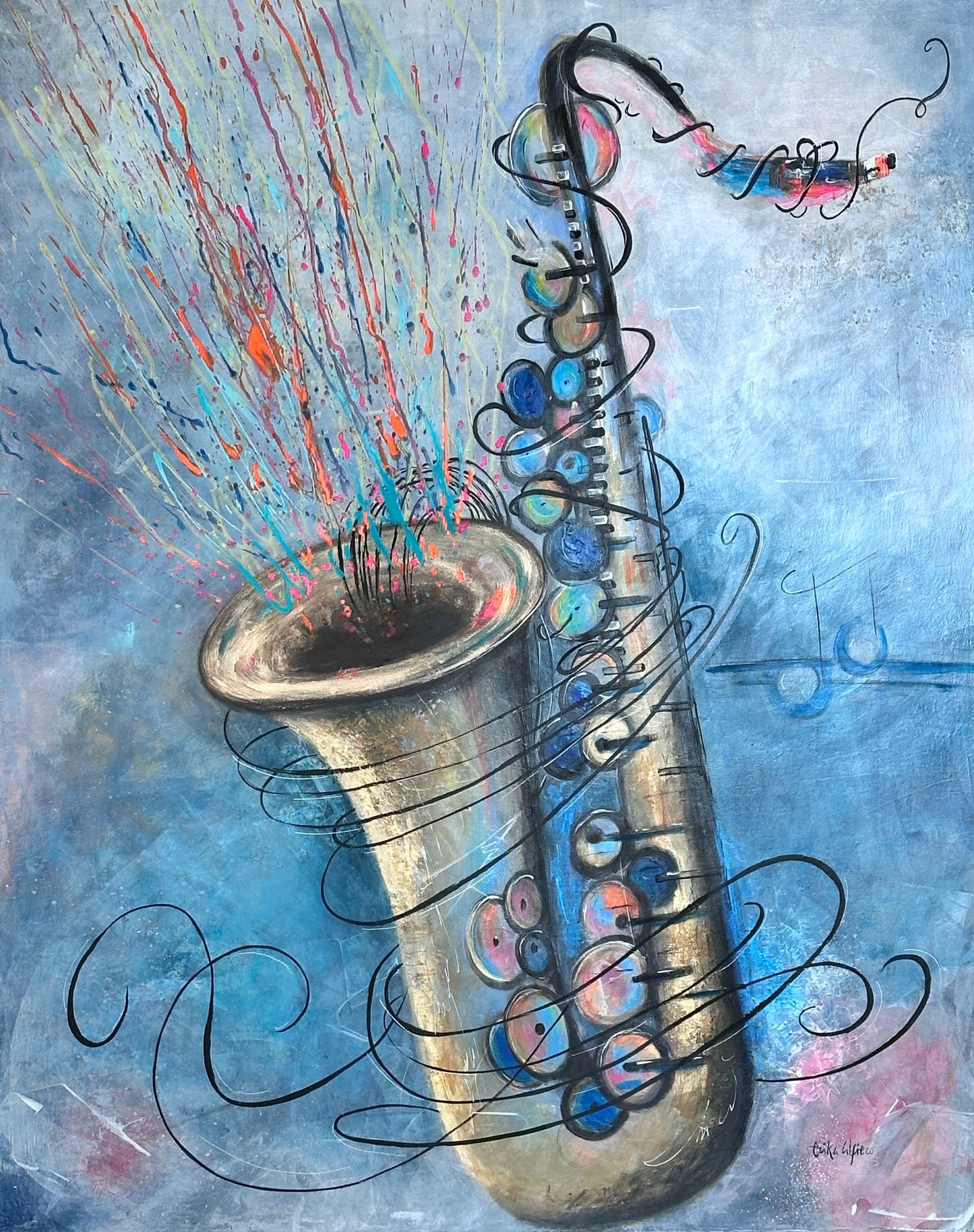 En esta obra, entre pincels y trazos, el saxofón dorado no solo emite sonidos, sino que también desvela emociones ocultas en cada textura y cada color. Las ondas de viento que entran en el instrumento transportan no solo música, sino recuerdos, desafíos y sueños, transformándolos en vibrantes explosiones de color. Cada trazo refleja la complejidad y la belleza de la vida misma, donde las emociones del artista y del espectador se entrelazan, contribuyendo a la narrativa romántica y técnica de la obra. Así, cada elemento vibra con la esencia del jazz, convirtiendo la música en una danza de sentimientos y color.