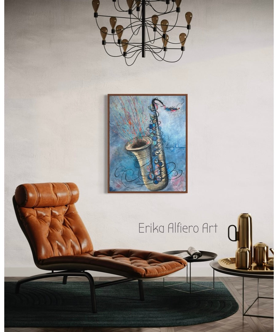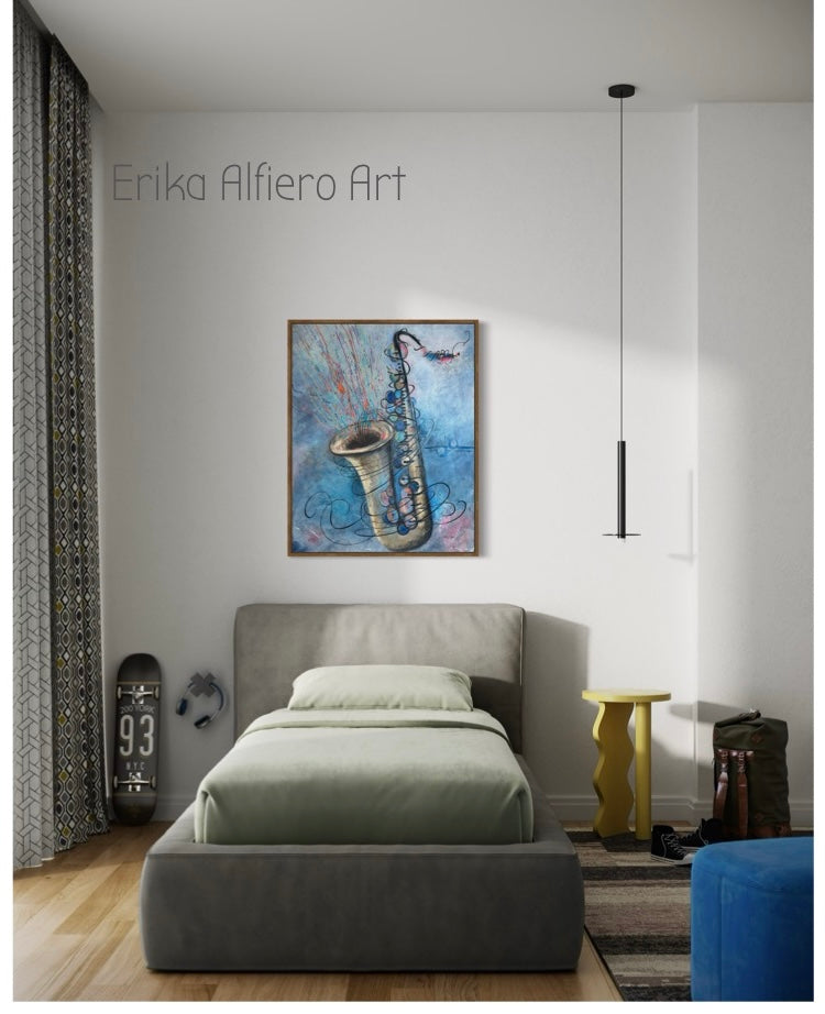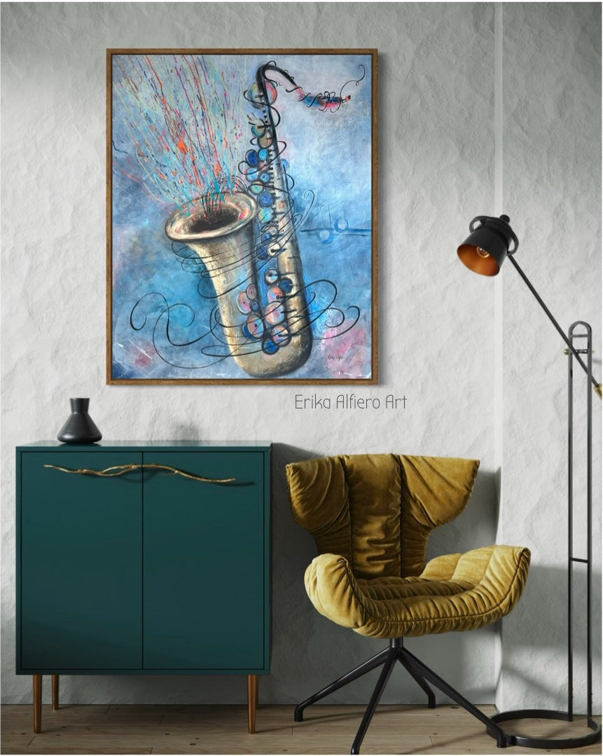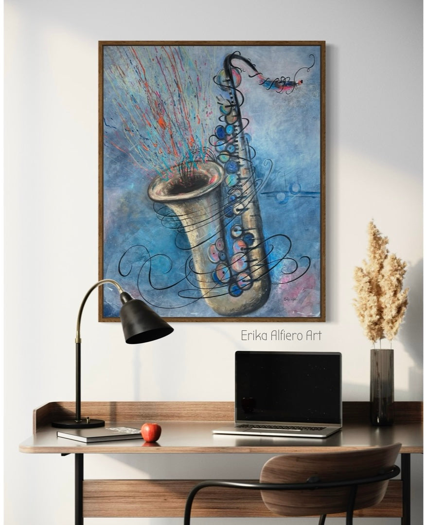 On this canvas, between brushes and strokes, the golden saxophone not only emits sounds but also reveals hidden emotions in every texture and color. The wind waves entering the instrument carry not only music but also memories, challenges, and dreams, transforming them into vibrant explosions of color. Each stroke reflects the complexity and beauty of life itself, where the emotions of the artist and the viewer intertwine, contributing to the romantic and technical narrative of the piece. Thus, every element vibrates with the essence of jazz, turning music into a dance of feelings and color.