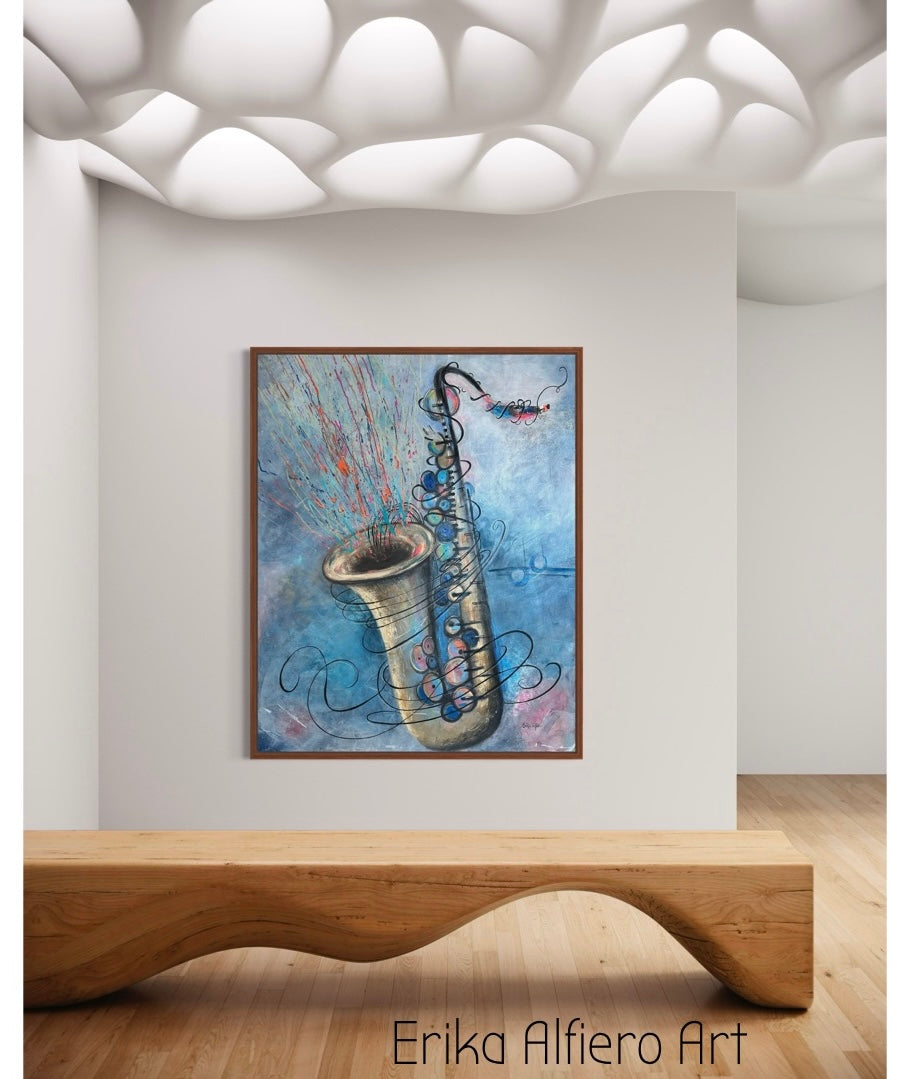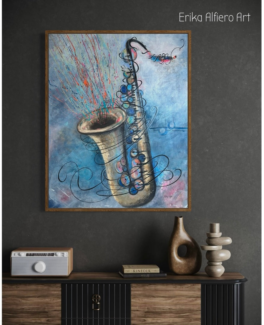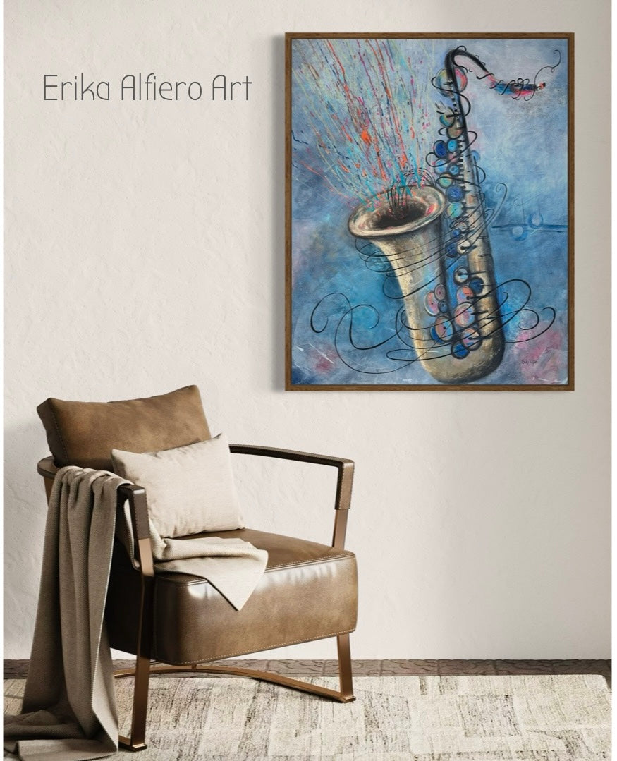 On this canvas, between brushes and strokes, the golden saxophone not only emits sounds but also reveals hidden emotions in every texture and color. The wind waves entering the instrument carry not only music but also memories, challenges, and dreams, transforming them into vibrant explosions of color. Each stroke reflects the complexity and beauty of life itself, where the emotions of the artist and the viewer intertwine, contributing to the romantic and technical narrative of the piece. Thus, every element vibrates with the essence of jazz, turning music into a dance of feelings and color.