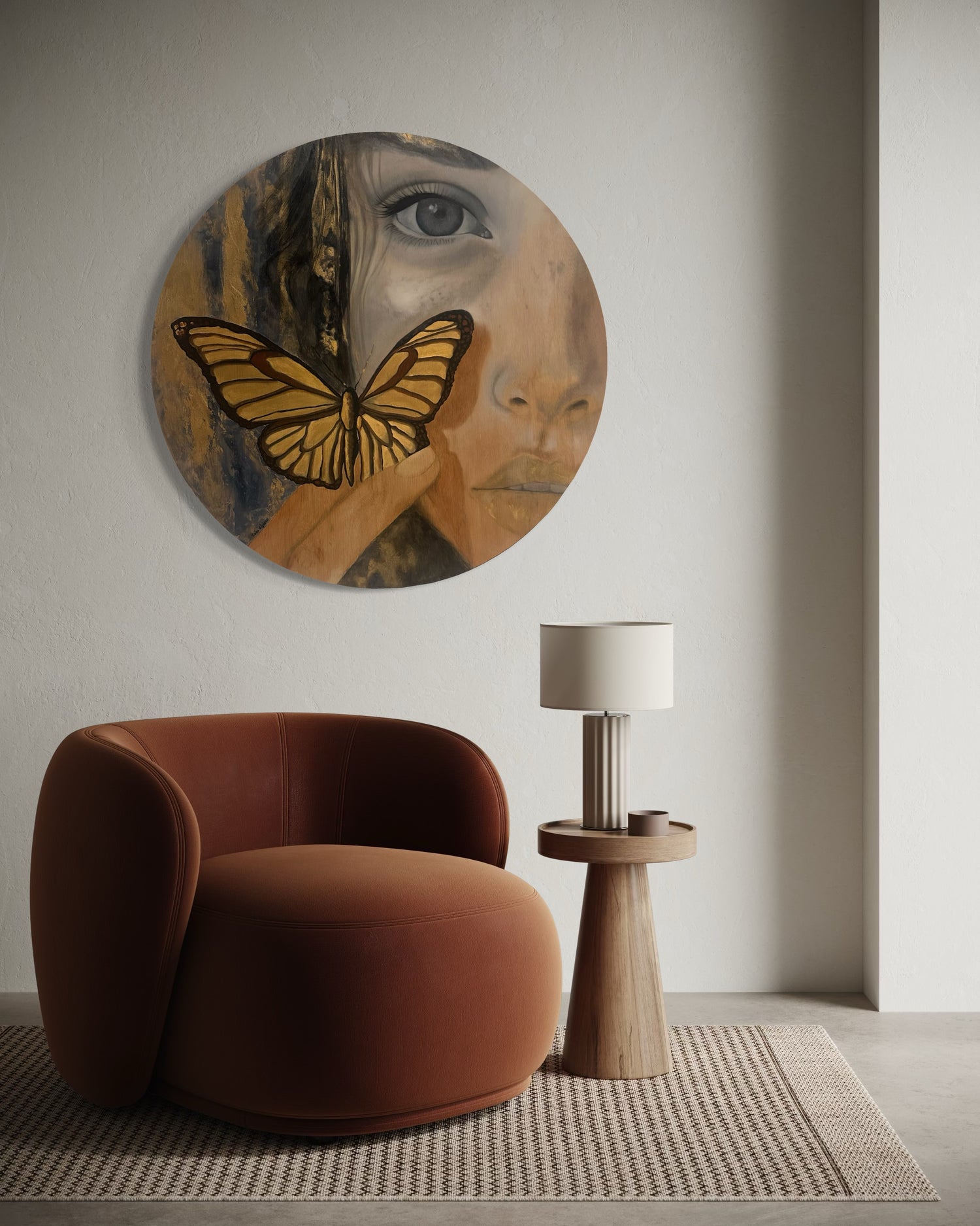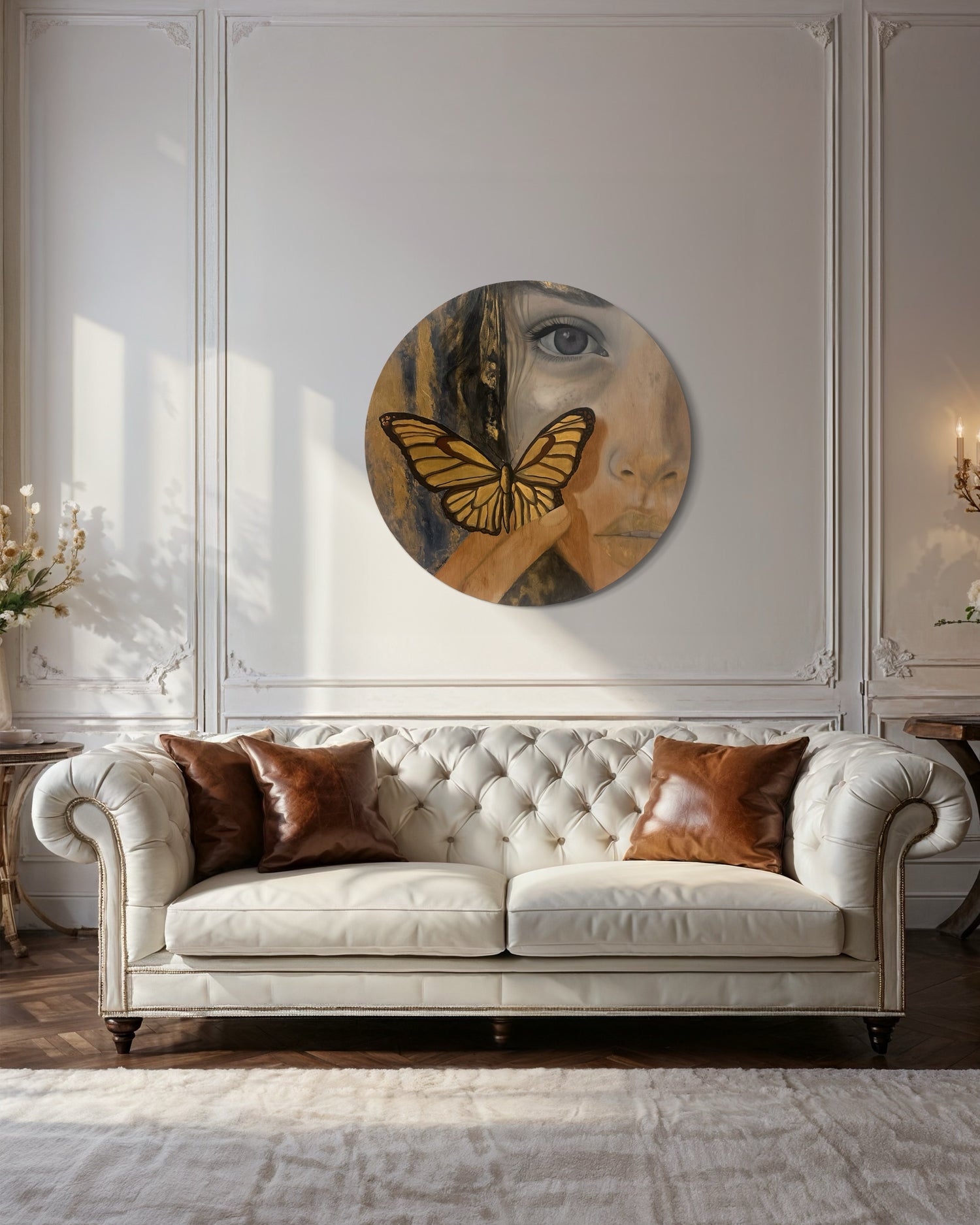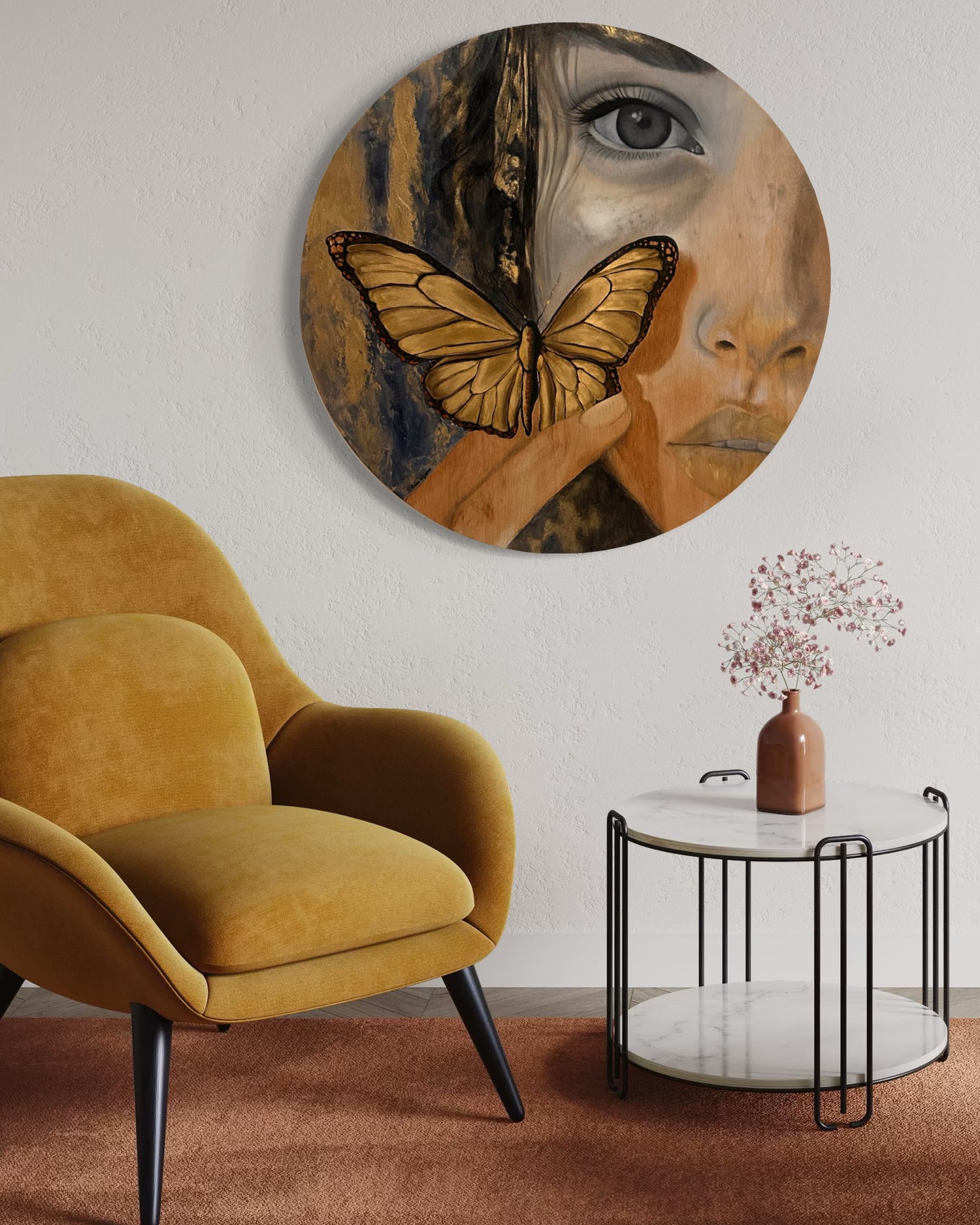 Una mariposa dorada, símbolo de renacimiento y esperanza, se posa suavemente sobre el rostro, como si la piel misma guardara el secreto de su vuelo.