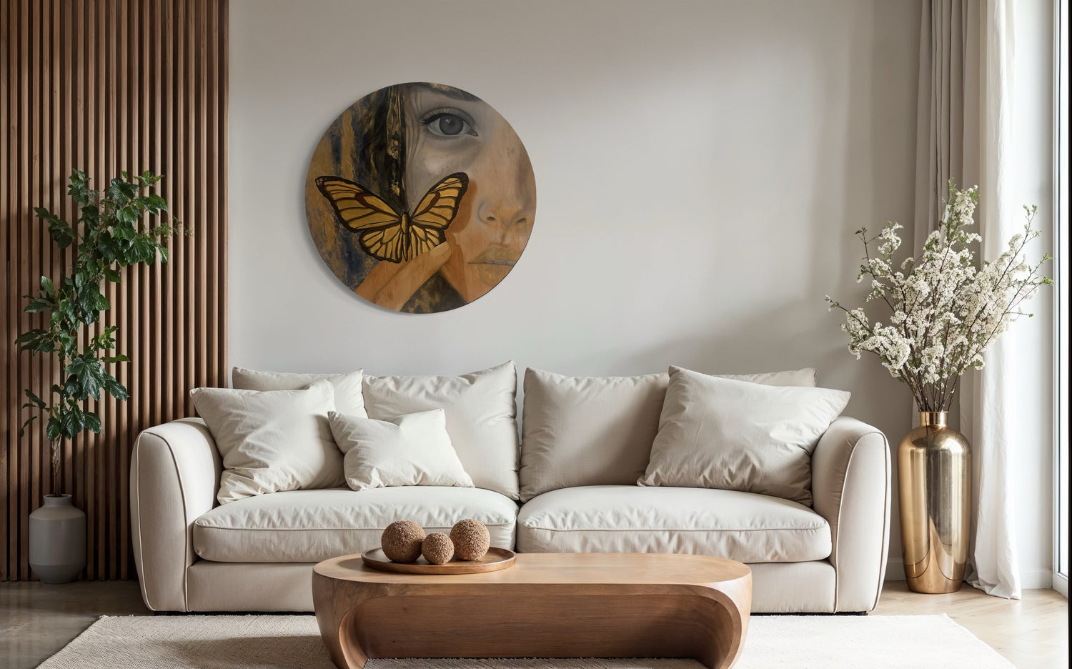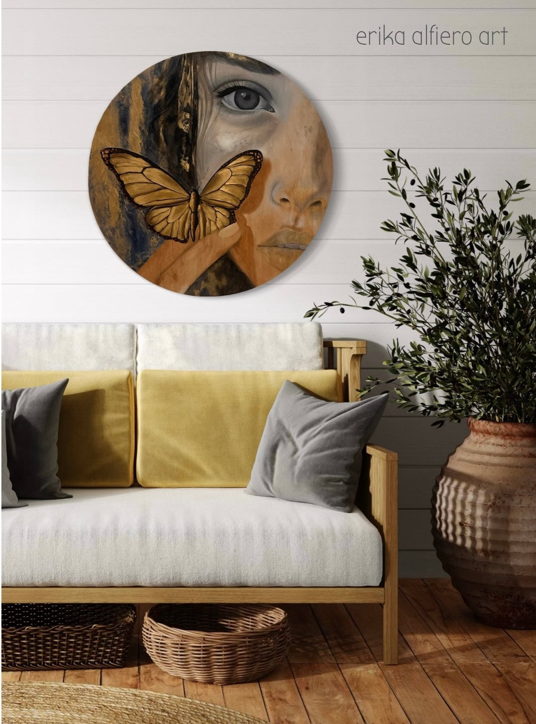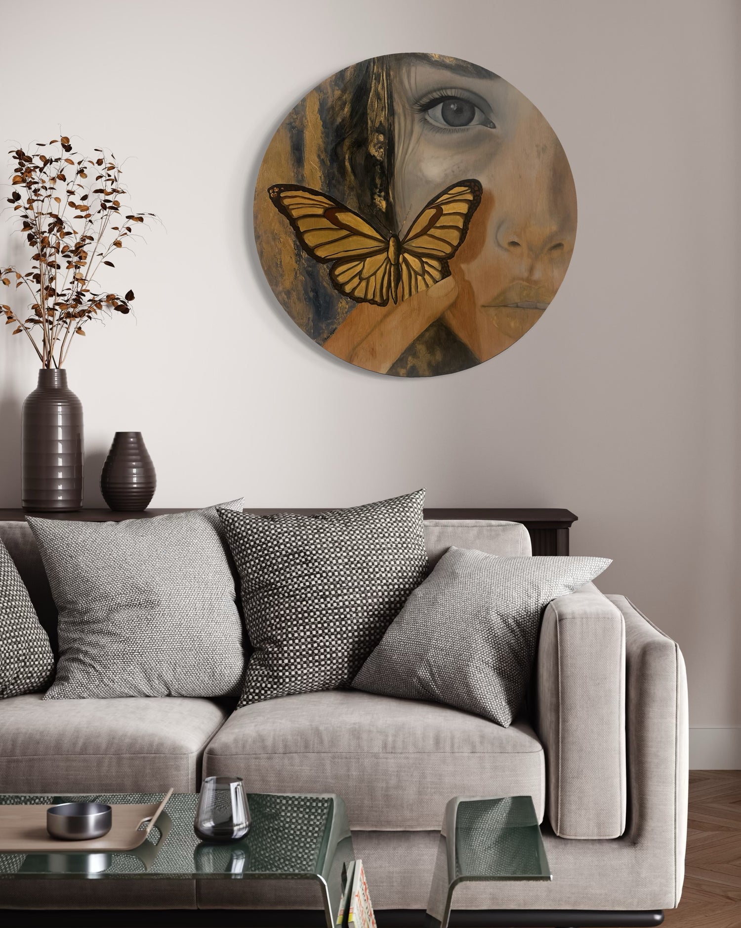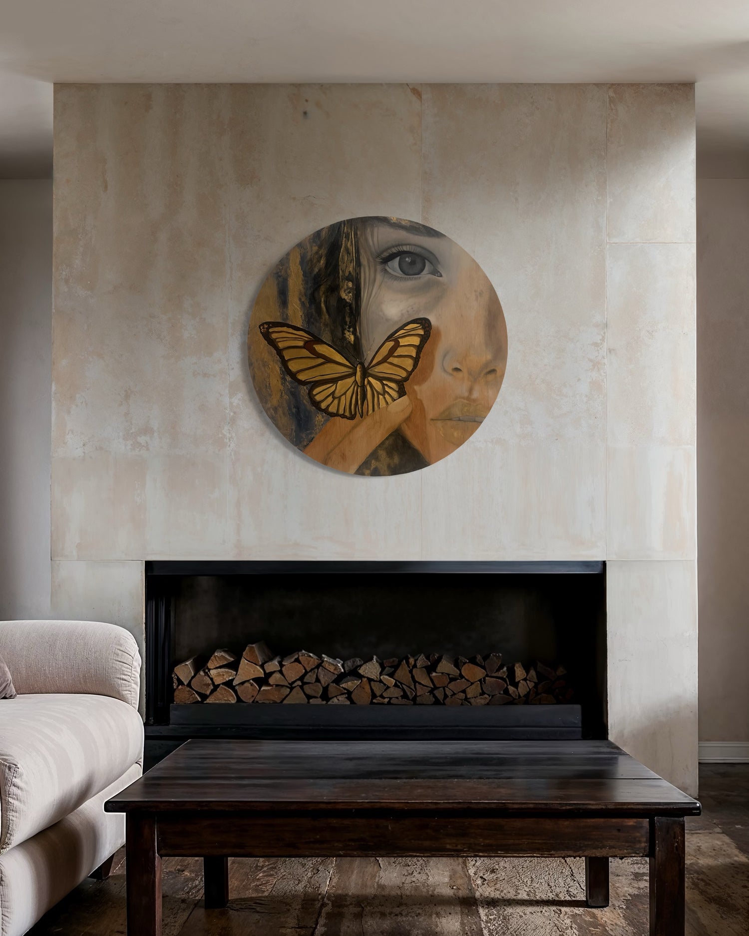 Una mariposa dorada, símbolo de renacimiento y esperanza, se posa suavemente sobre el rostro, como si la piel misma guardara el secreto de su vuelo.